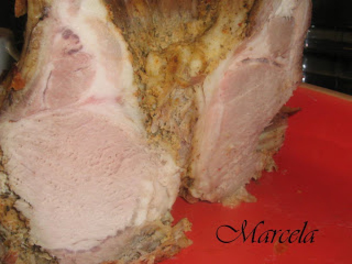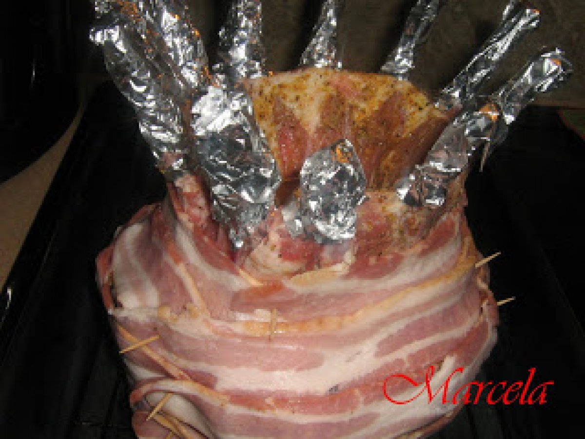 Pork crown roast PrecedentulUrmătorul Felul principalFoarte ușor1 h 30 m Trimite unui prieten Printează pagina Adresează o întrebare autorului Postează o poză cu rețeta gătită de tine Ingrediente 6 cotlet de porc cu coaste(al meu a fost de 11 coaste) 500g bacon afumat scobitori cimbru praf de usturoi sare piper ulei de masline lamaie paprika condimente grecesti folie de aluminiu