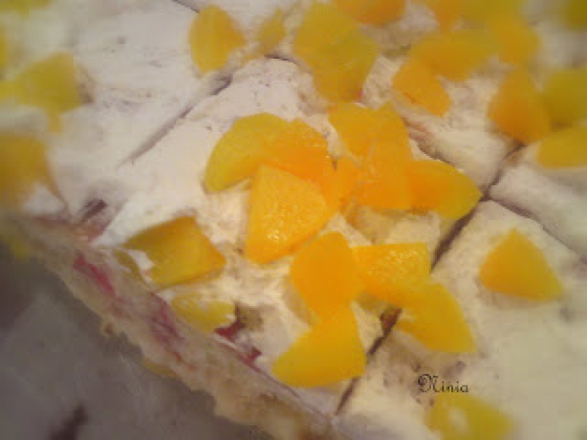 Prajitura cu budinca de vanilie si caise PrecedentulUrmătorul Felul principalFoarte ușor50 min Trimite unui prieten Printează pagina Adresează o întrebare autorului Postează o poză cu rețeta gătită de tine Ingrediente 4 400 g zahar 3 oua 75 g unt 3 linguri miere 225 ml lapte 1 lingurita amoniac 450 g faina 2 plicuri budinca vanilie 800 ml lapte piersici cubulete dintr-un compot 2 pliculete gelatina alba 200 ml apa 2 pliculete gelatina roz 500 ml apa frisca hulala