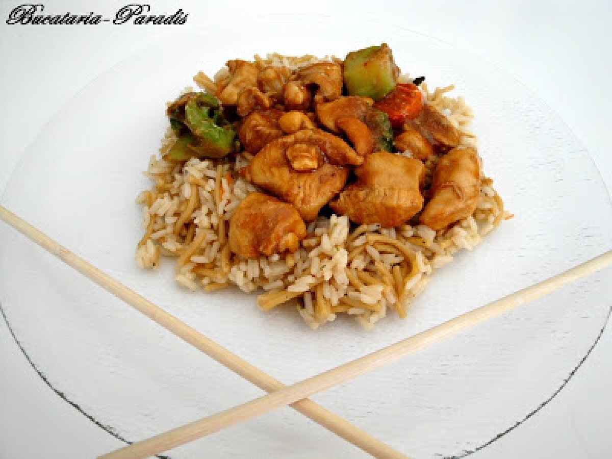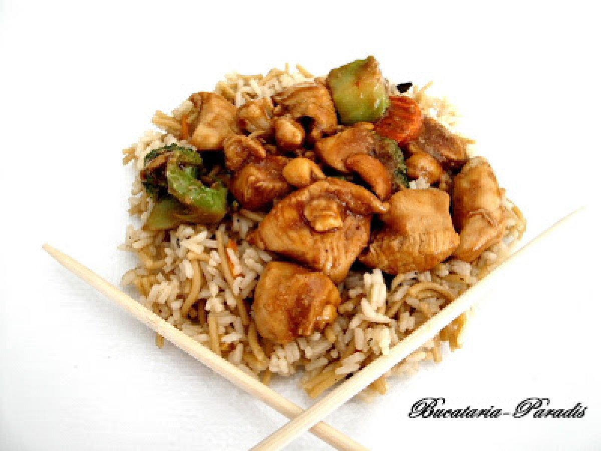 Pui cu alune si orez cu noodles PrecedentulUrmătorul Felul principalFoarte ușor45 min Trimite unui prieten Printează pagina Adresează o întrebare autorului Postează o poză cu rețeta gătită de tine Ingrediente 4 2 linguri de ulei 1 cepe 1 catel de usturoi 3 bucati piept de pui 225 g broccoli 2 morcovi 3 linguri unt de arahide si 300 grame alune caju 3 linguri sos de soia
