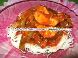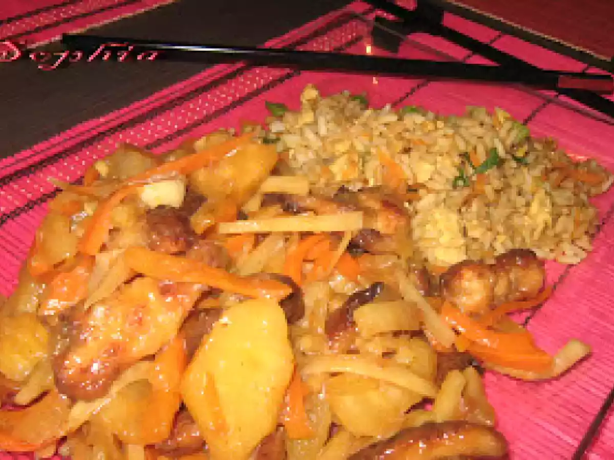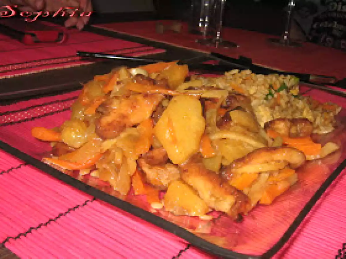 Pui cu ananas PrecedentulUrmătorul Felul principalFoarte ușor55 min Trimite unui prieten Printează pagina Adresează o întrebare autorului Postează o poză cu rețeta gătită de tine Ingrediente 6 300 g piept de pui dezosat 2 morcovi 1 bucata de telina 1 cutie de compot de ananas bucati 1 ceapa 2 catei de usturoi 1 lingura de praf de ghimbir sos de soia amidon de porumb ulei