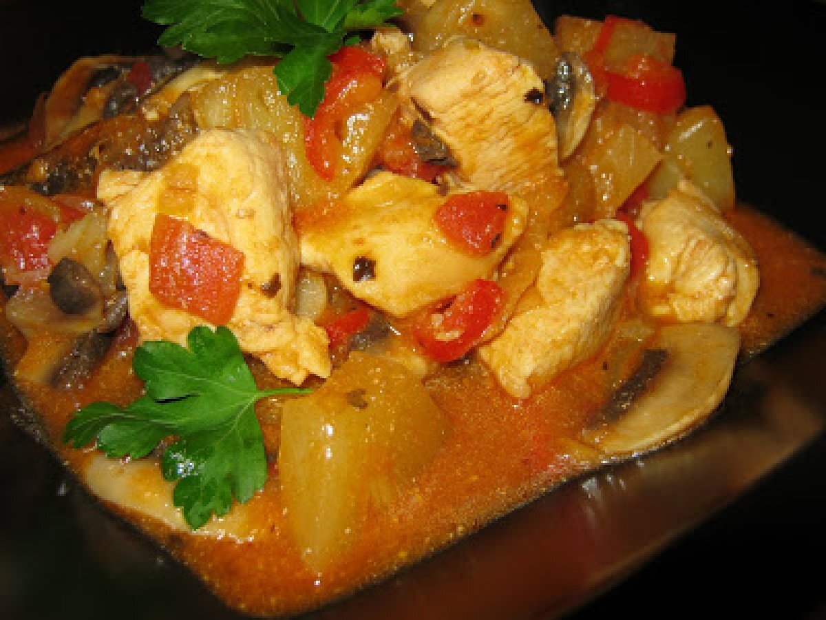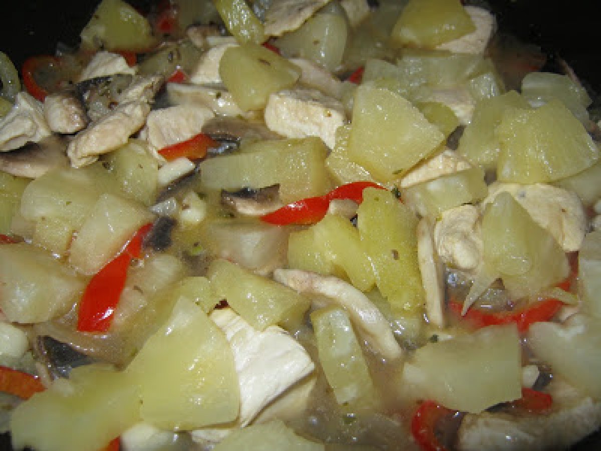 Pui cu ciuperci i ananas în sos dulce-acrior PrecedentulUrmătorul Felul principalFoarte ușor40 min Trimite unui prieten Printează pagina Adresează o întrebare autorului Postează o poză cu rețeta gătită de tine Ingrediente 6 150 g piept de pui, 150 g ananas din conserva, 1 ardei rosu, 2 cepe, 2 - 3 linguri de rosii cuburi in sos, 3-4 ciuperci, oregano, busuioc, sare, piper, 2 lingurite de otet de vin, 2 linguri dressing vinaigrette