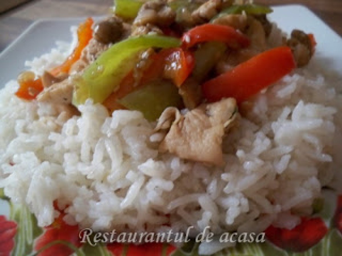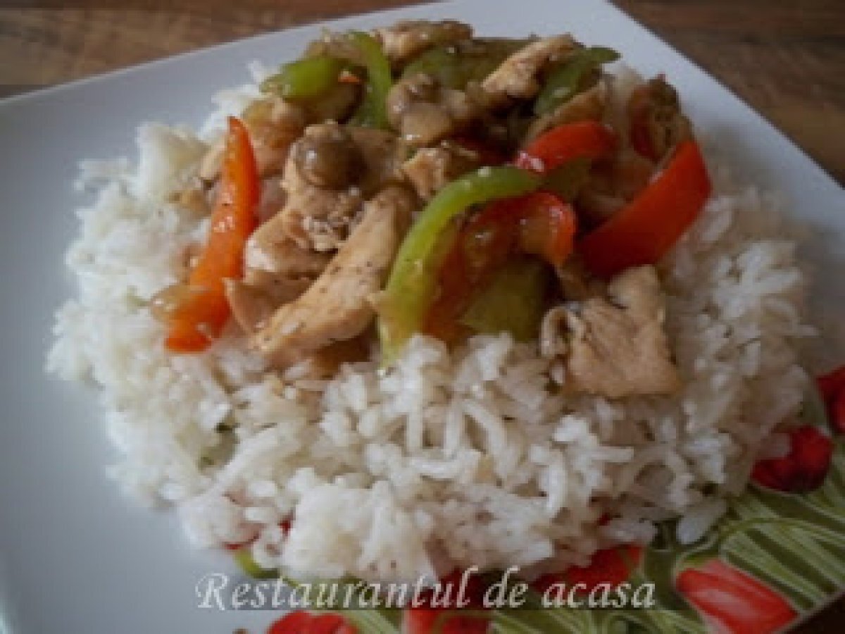 Pui cu legume , sos de soia si susan PrecedentulUrmătorul Felul principalFoarte ușor35 min93 Kcal Trimite unui prieten Printează pagina Adresează o întrebare autorului Postează o poză cu rețeta gătită de tine Ingrediente 4 1 piept de pui , 1/2 ardei gras verde , 1/2 ardei gras rosu , 1 ceapa mica , 1/2 conserva ciuperci , sos de soia , susan , ulei , sare , piper. Cost estimat: 2.25Euros€ (0.56€/porție)