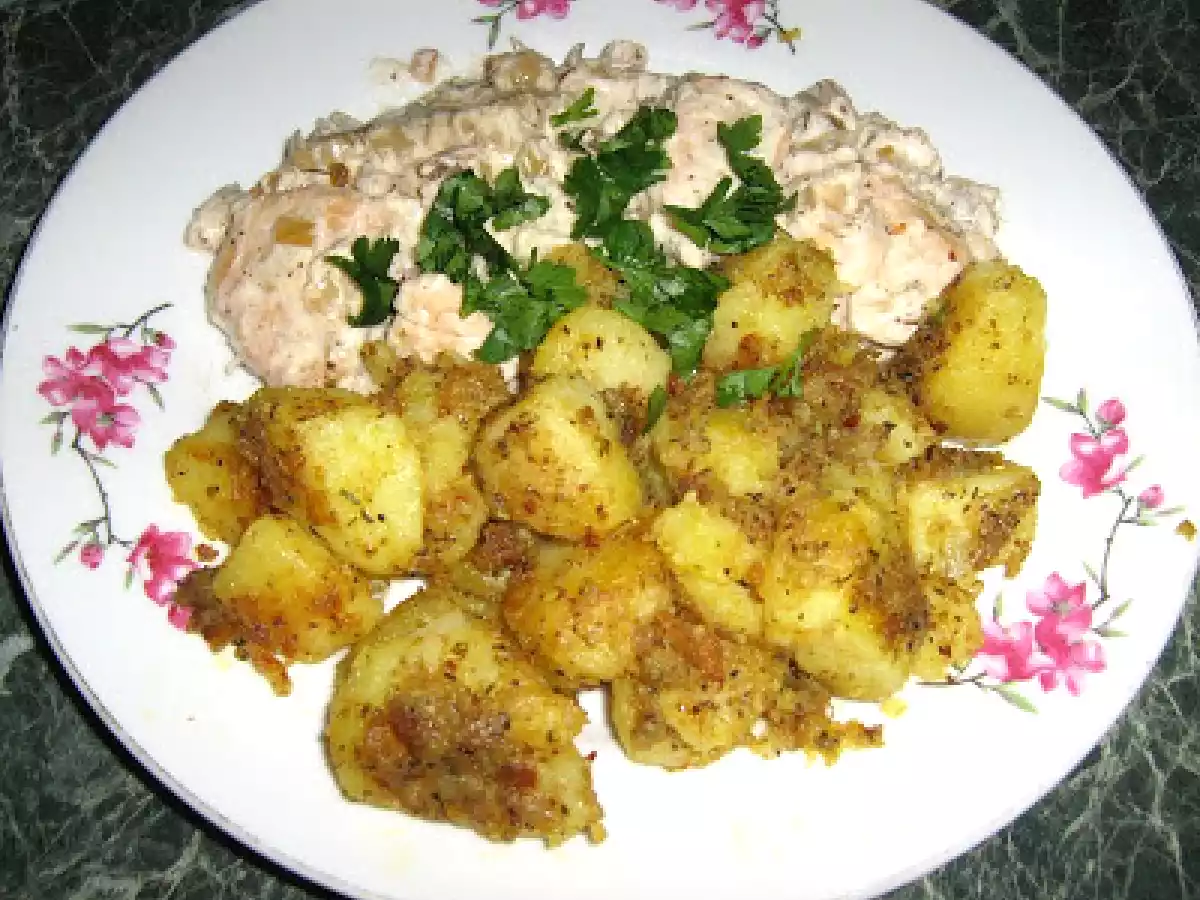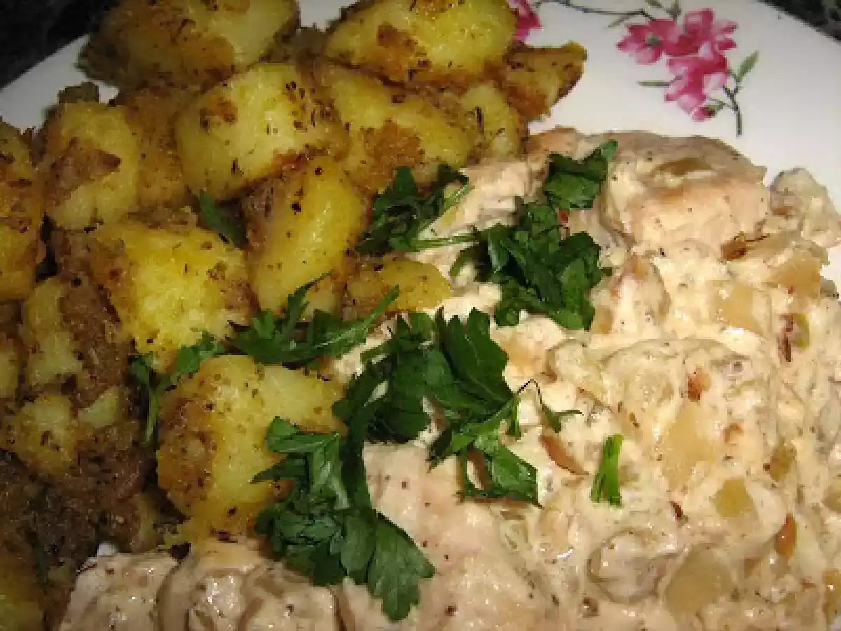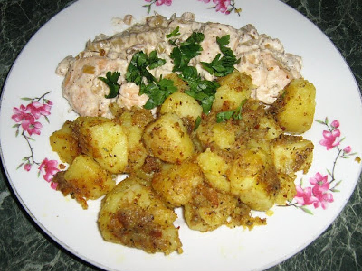 Pui cu sos de smantana si cartofi picanti cu curry PrecedentulUrmătorul Felul principalFoarte ușor1 oră Trimite unui prieten Printează pagina Adresează o întrebare autorului Postează o poză cu rețeta gătită de tine Ingrediente 2 o bucata piept de pui mai mare taiata bucatele 4-5 cartofi 200g smanatana 2-3 catei de usturoi 50 g unt sau ulei patrunjel o ceapa medie condimente: sare, piper, curry, boia iute,