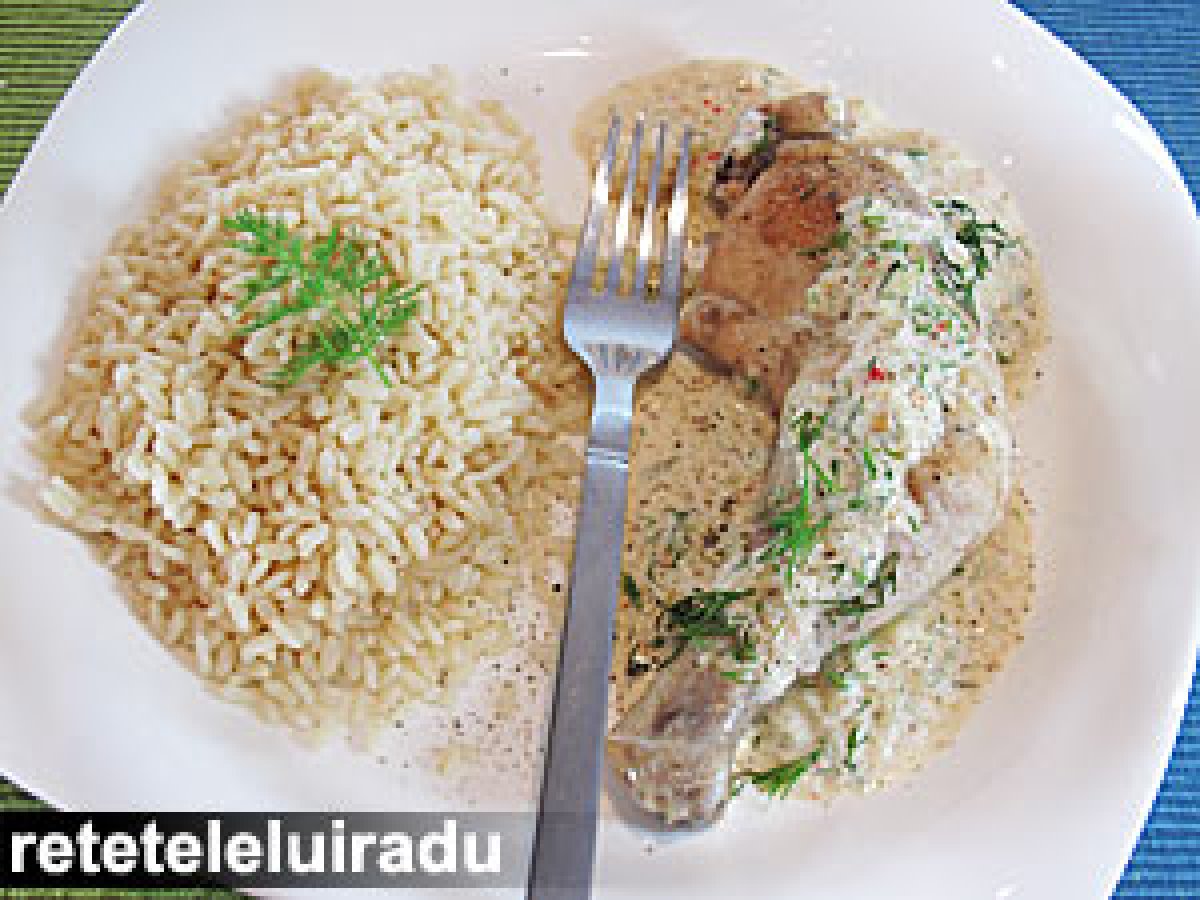 Pui cu sos de telina si smantana Felul principalFoarte ușor37 min Trimite unui prieten Printează pagina Adresează o întrebare autorului Postează o poză cu rețeta gătită de tine Ingrediente 2 2 copane de pui, circa 450 g in total, fara - piele 250 g orez fiert, pentru servit 2 tulpini de telina 2 linguri de ulei de floarea-soarelui 1 ceapa mare, feliata 2 catei de usturoi, tocati 1 ardei iute mic, curatat de seminte si tocat 120 ml vin alb 120 ml fond de pui, sau de legume 200 ml smantana pentru gatit 32% grasimi 1 lingura de marar proaspat, tocat sare piper negru, proaspat macinat frunze proaspete de marar, pentru ornat