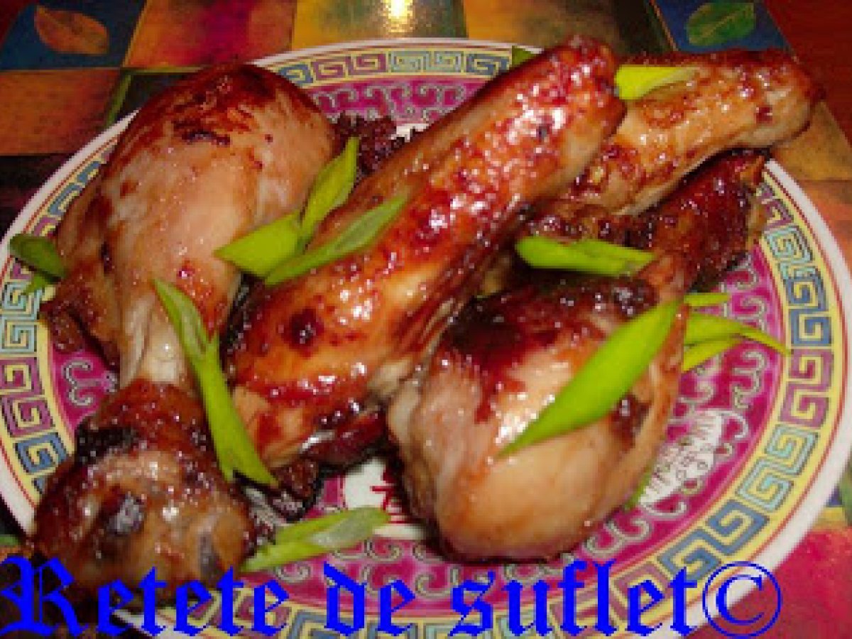 Pui glazurat cu miere (honey glazed chicken) votează acum Felul principalFoarte ușor46 min Trimite unui prieten Printează pagina Adresează o întrebare autorului Postează o poză cu rețeta gătită de tine Ingrediente 4 4 aripi de pui 4 ciocanele (pulpe superioare) 2 linguri miere 3 linguri sos de soia 2 catei de usturoi, rasi fin 2 cm de ghimbir proaspat, ras 1/4 lingurita chilli 2 linguri amidon de porumb (sau o lingura faina) ceapa verde, pentru ornatulei pentru prajit (deep fry)