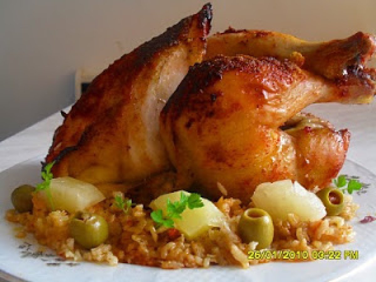Pui la cuptor cu ananas Felul principalFoarte ușor40 min Trimite unui prieten Printează pagina Adresează o întrebare autorului Postează o poză cu rețeta gătită de tine Ingrediente 2 1 pui 200 g orez sos de rosii rozmarin cimbru boia de ardei iute ananas masline sare piper ulei