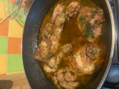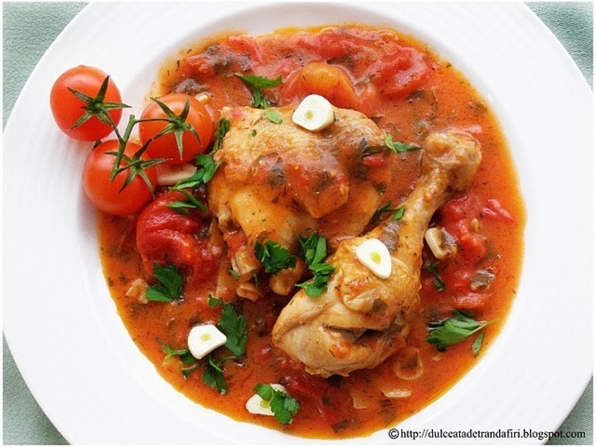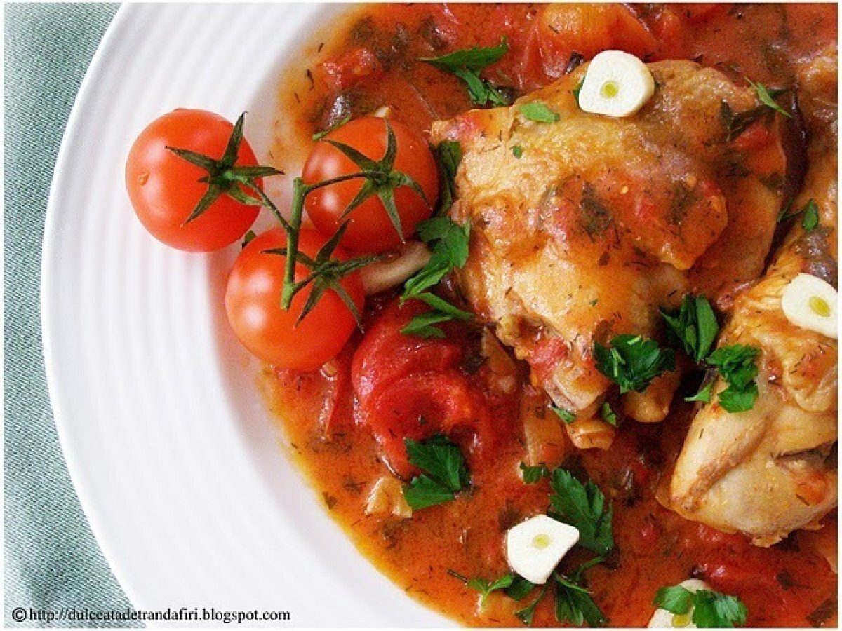 Pui la tigaie cu rosii si usturoi PrecedentulUrmătorul Felul principalUșor30 min Trimite unui prieten Printează pagina Adresează o întrebare autorului Postează o poză cu rețeta gătită de tine Ingrediente 2 Pentru 2 portii indestulatoare iti trebuie: 1. 2 pulpe intregi de pui (adica doua superioare si doua inferioare) 2. o conserva de rosii intregi despielitate in suc propriu (250 gr) 3. 80 ml ulei 4. optional 2 linguri de faina 5. o capatana de usturoi 6. jumatate de pahar de vin alb 7. o legatura de patrunjel 8. o legatura de marar 9. sare, piper, condimente pentru pui