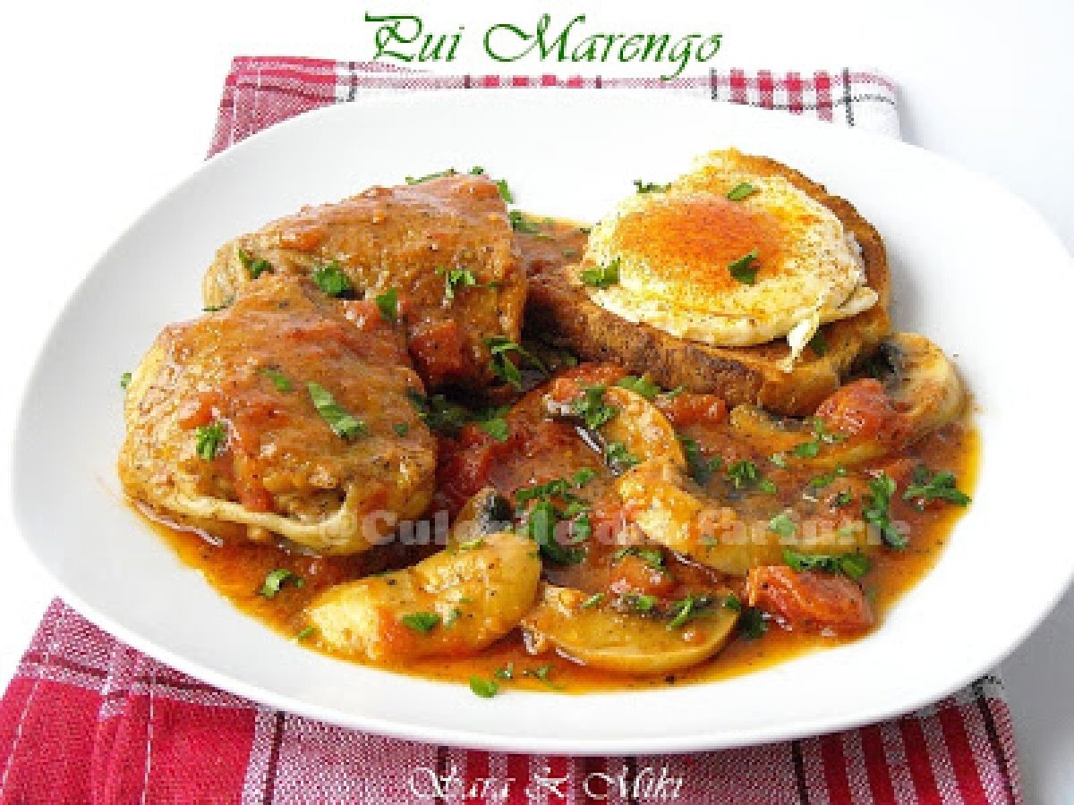 Pui marengo PrecedentulUrmătorul Felul principalFoarte ușor45 min Trimite unui prieten Printează pagina Adresează o întrebare autorului Postează o poză cu rețeta gătită de tine Ingrediente 6 1 pui taiat în bucati 1 ceapa 2 catei de usturoi 3 rosii 2 lg ulei de masline 60 g unt 1 pahare de vin rosu 1 foaie de dafin supa de pui 200 g ciuperci sare piper patrunjel tocat