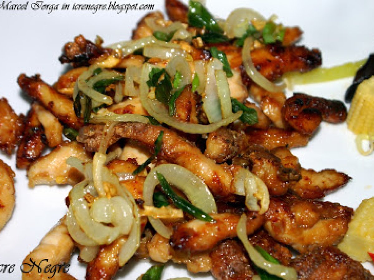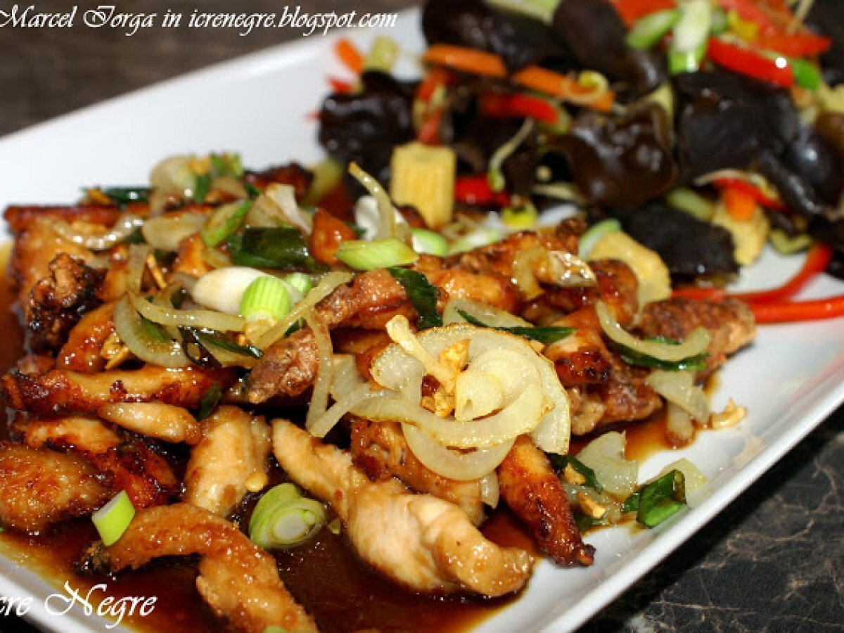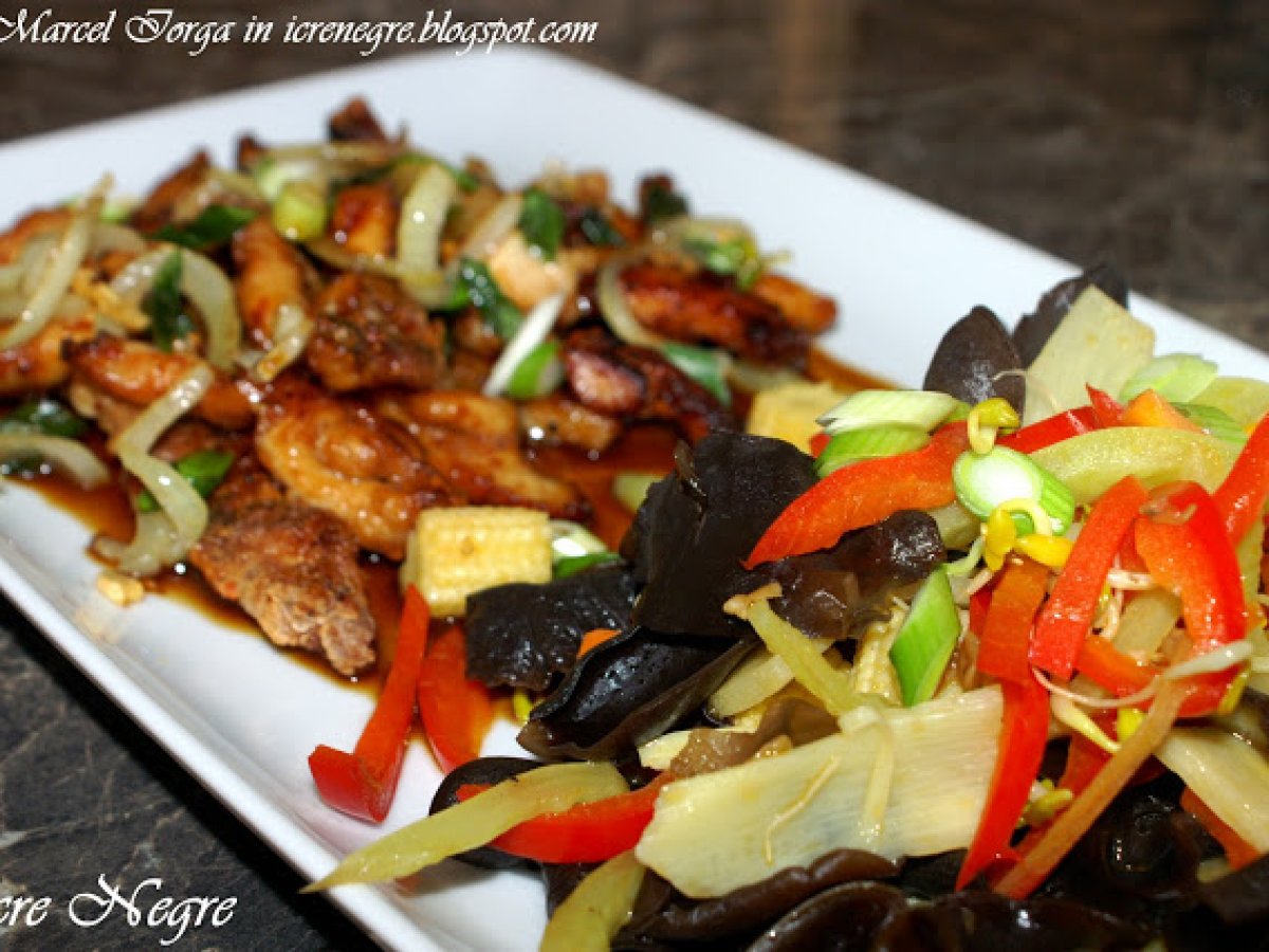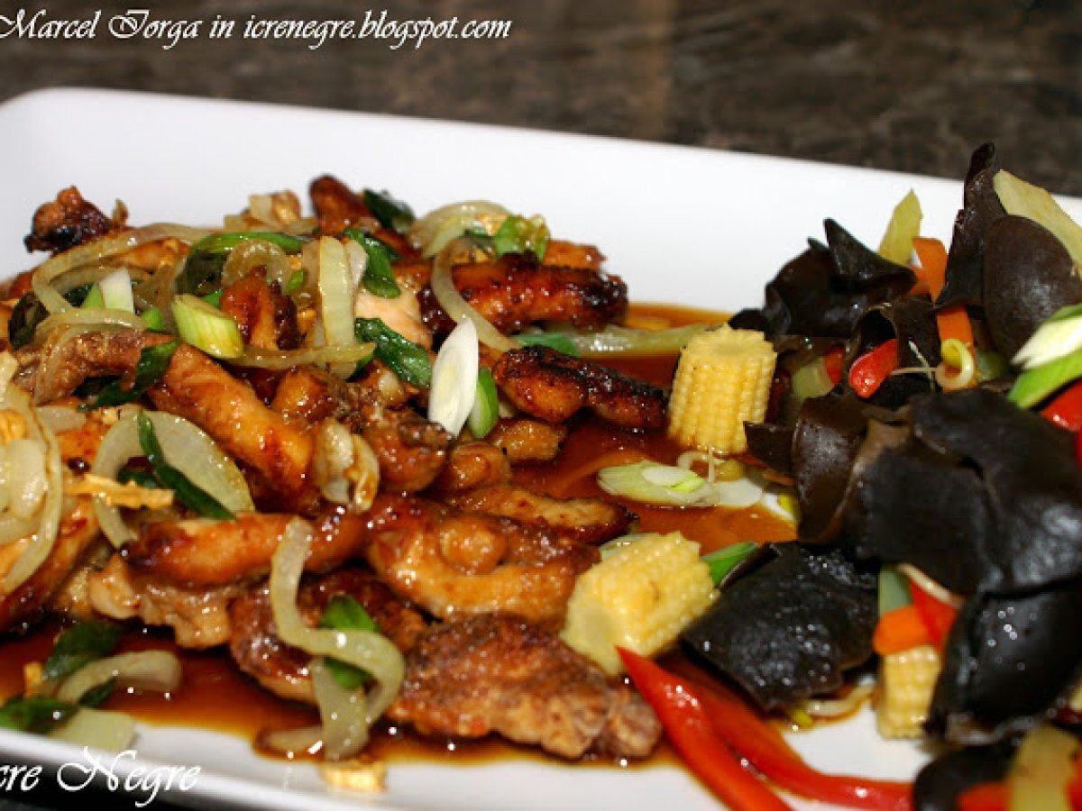 Pui mongolez (cu garnitura chinezeasca de legume) PrecedentulUrmătorul Felul principalFoarte ușor50 min Trimite unui prieten Printează pagina Adresează o întrebare autorului Postează o poză cu rețeta gătită de tine Ingrediente 6 1 piept de pui, dezosat si fara piele 3-4 linguri de amidon 3-4 catei de usturoi, tocati marunt 3-4 cepe verzi, taiati separat, partea alba de partea verde 100-150 ml de ulei de floarea soarelui, pentru prajit 1/4 cana de supa de pui 2 lingurite de sos Hoisin 1 lingurite de sos de stridii 2 lingurite de sos de soia 1 lingurita de vin de orez (sau dry sherry) 2 lingurite de zahar brun 2 lingurite de ardei iute rosu uscat si sfaramitat 1 ceapa alba taiata solzisori 1 ardei gras rosu taiat julien 1 ardei gras verde taiat julien 1/2 morcov taiat julien 6 buc de porumb tanar - babycorn (din conserva) taiat bucati 1/2 borcan de bambus 1/4 borcan de muguri de soia 10-12 buc de ciuperci urechi de lemn, pe care le hidratam 30 de minute in apa fierbinte si le taiem bucatele