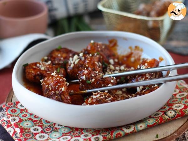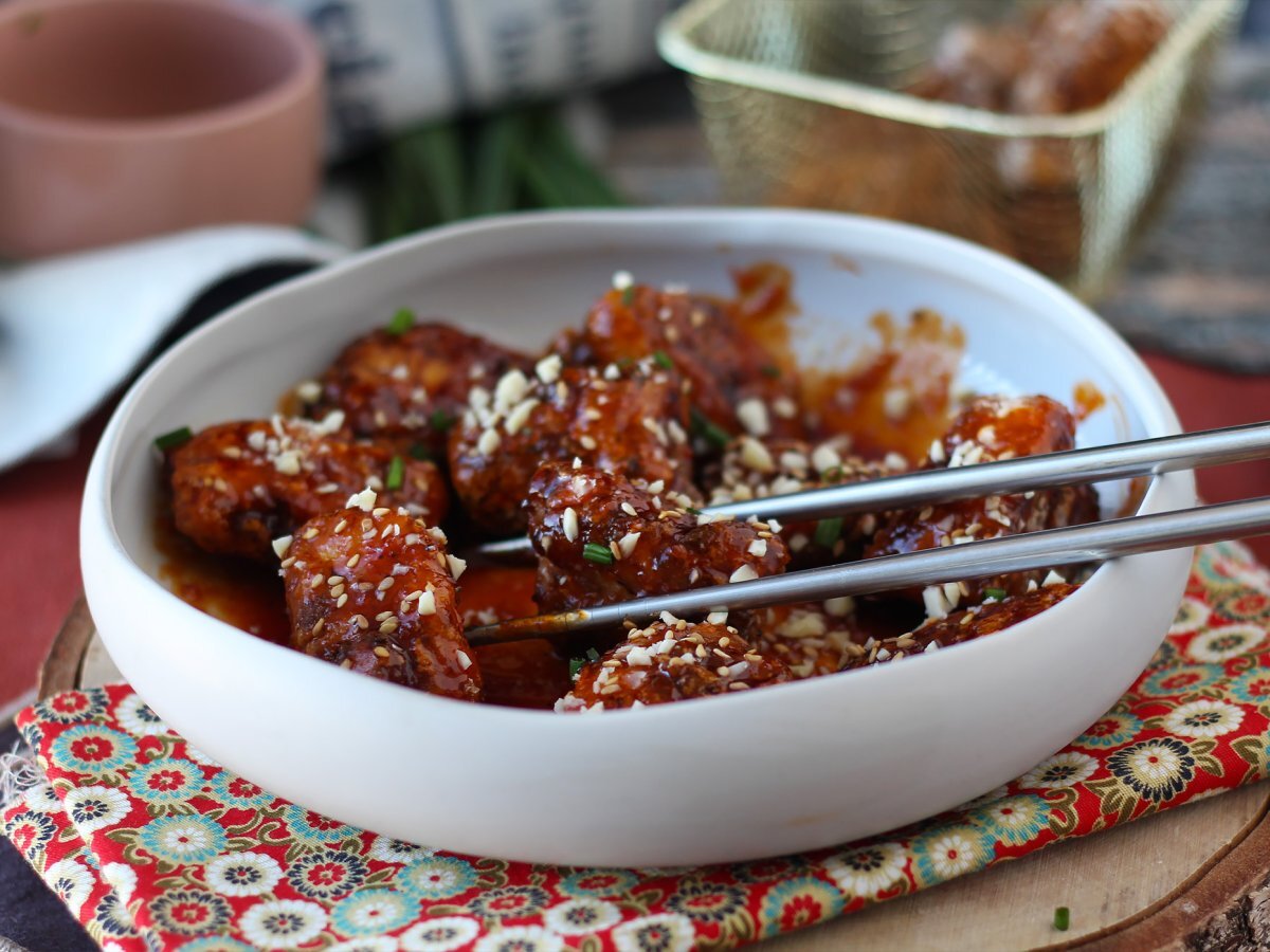 Iubitori de mâncăruri dulci-sărate și picante, această rețetă este făcută pentru voi! Ne plac aromele asiatice și nota crocantă a acestor bucățele de pui Dakgangjeong.Gochujang vă va încălzi inima și vă va duce într-o călătorie către Coreea, unde în general ne bucurăm de pui prăjit însoțit de bere, da da :-) În Coreea, îl numim „chimaek” (치맥), combinația de „chi” pentru pui și „maek” care înseamnă bere (de consumat cu moderație desigur!) . Aici, ne place să-l însoțim cu orez basmati, pentru o masă completă și delicioasă ;-) Urmați pașii rețetei de mai jos:
