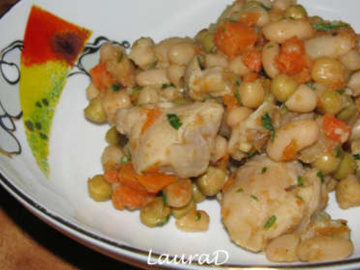 Pulpe de pui cu fasole alba si mazare Felul principalFoarte ușor30 min Trimite unui prieten Printează pagina Adresează o întrebare autorului Postează o poză cu rețeta gătită de tine Ingrediente 4 1 lingura ulei de masline 1 ceapa, tocata 1 catel de usuturoi, zdrobit 4 pulpe de pui, dezosate, curatate de piele, apoi taiate cubulete 200 ml supa de legume 1 conserva (400 gr) mazare cu bucatele de morcovi (sau doar mazare) 1 conserva (400 gr) fasole alba, scursa 1 mana de patrunjel tocat