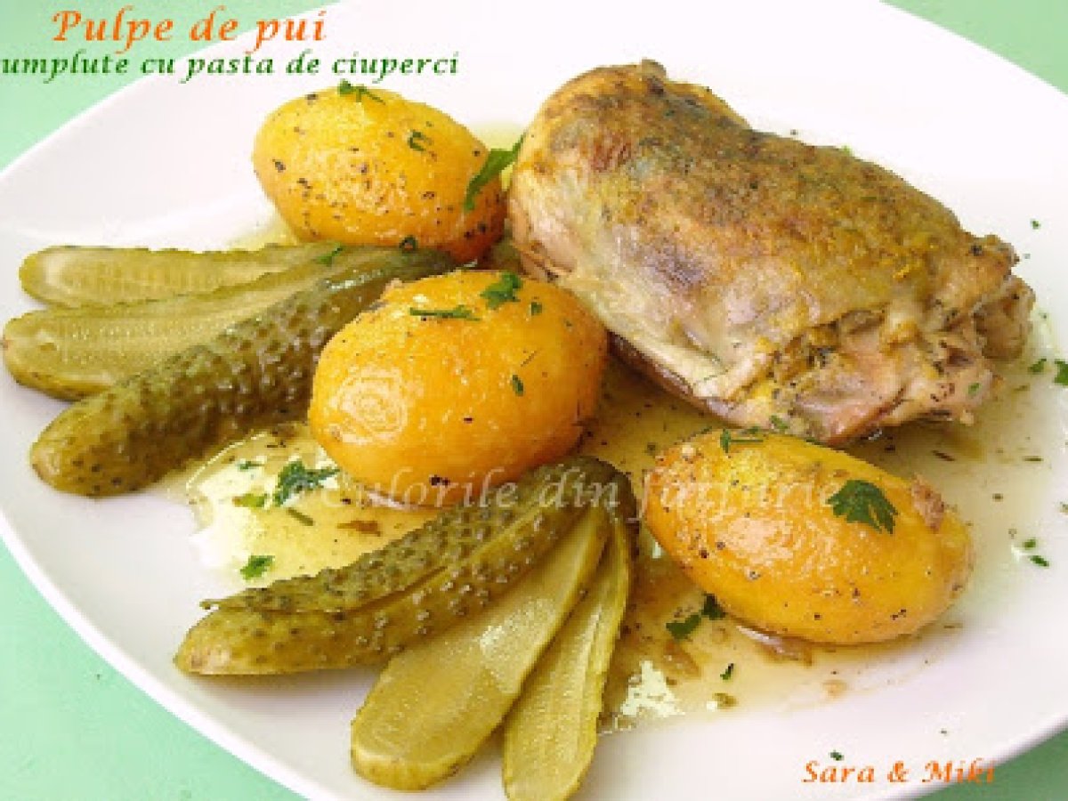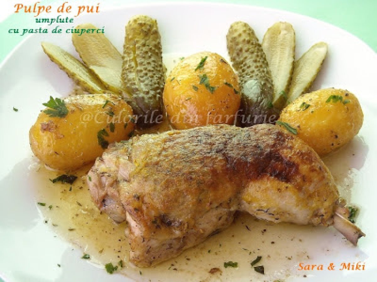 Pulpe de pui umplute cu pasta de ciuperci PrecedentulUrmătorul Felul principalFoarte ușor35 min Trimite unui prieten Printează pagina Adresează o întrebare autorului Postează o poză cu rețeta gătită de tine Ingrediente 4 6-8 pulpe intregi de pui 150 g ciuperci 1 ceapa mica 50 g unt 1 catel de usturoi 1 lg. de pesmet 100 ml vin alb piper sare patrunjel tocat cartofi castravet murati