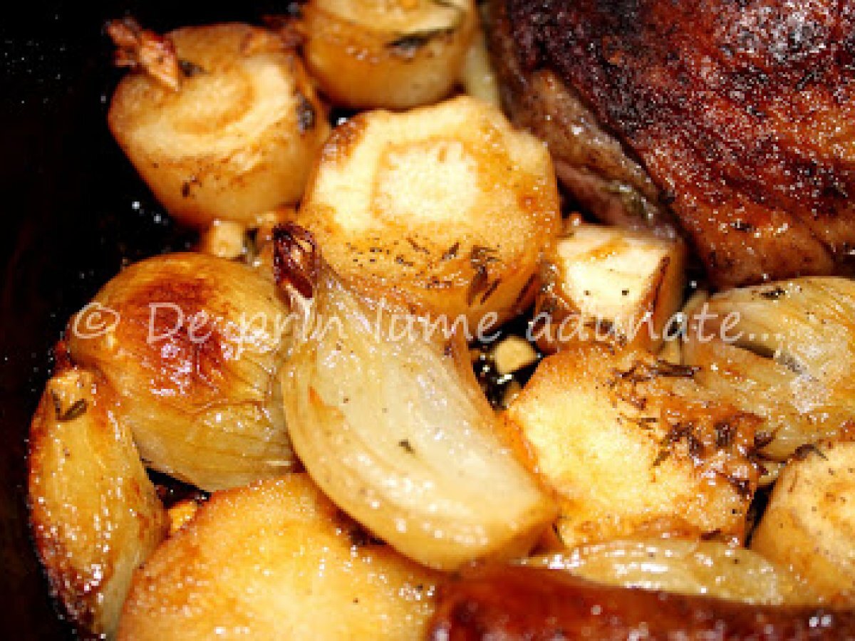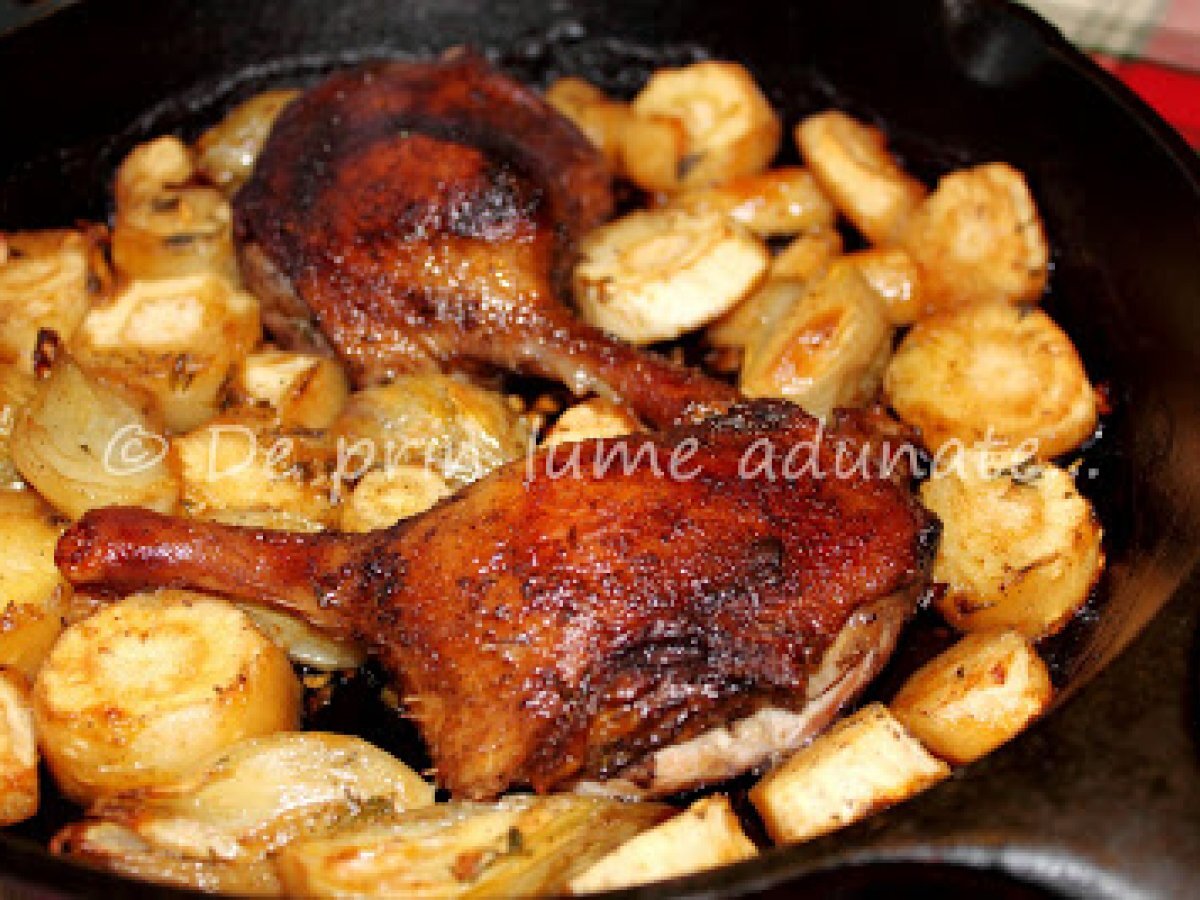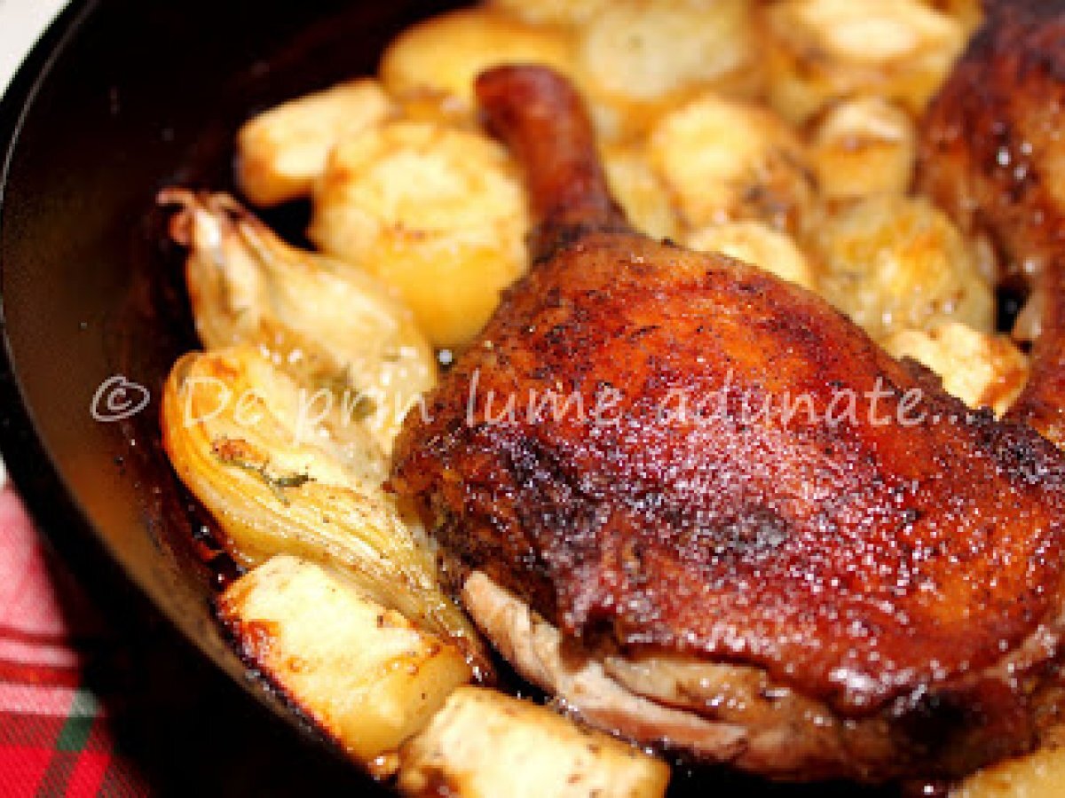 Pulpe de rata brezate cu pastarnac PrecedentulUrmătorul Felul principalFoarte ușor45 min Trimite unui prieten Printează pagina Adresează o întrebare autorului Postează o poză cu rețeta gătită de tine Ingrediente 6 2 pulpe de rata sare si piper dupa gust 2 linguri ulei de masline 1/4 lingurita ienibahar pudra 4-5 salote taiate in jumatate pe lung 3-4 pastarnaci mari taiati felii rotunde de aprox 1,5 cm 1 lingurita cimbrisor tocat 1 lingura usturoi tocat 1 foaie de dafin 1/2 cana vin alb 1-2 cani supa de pui