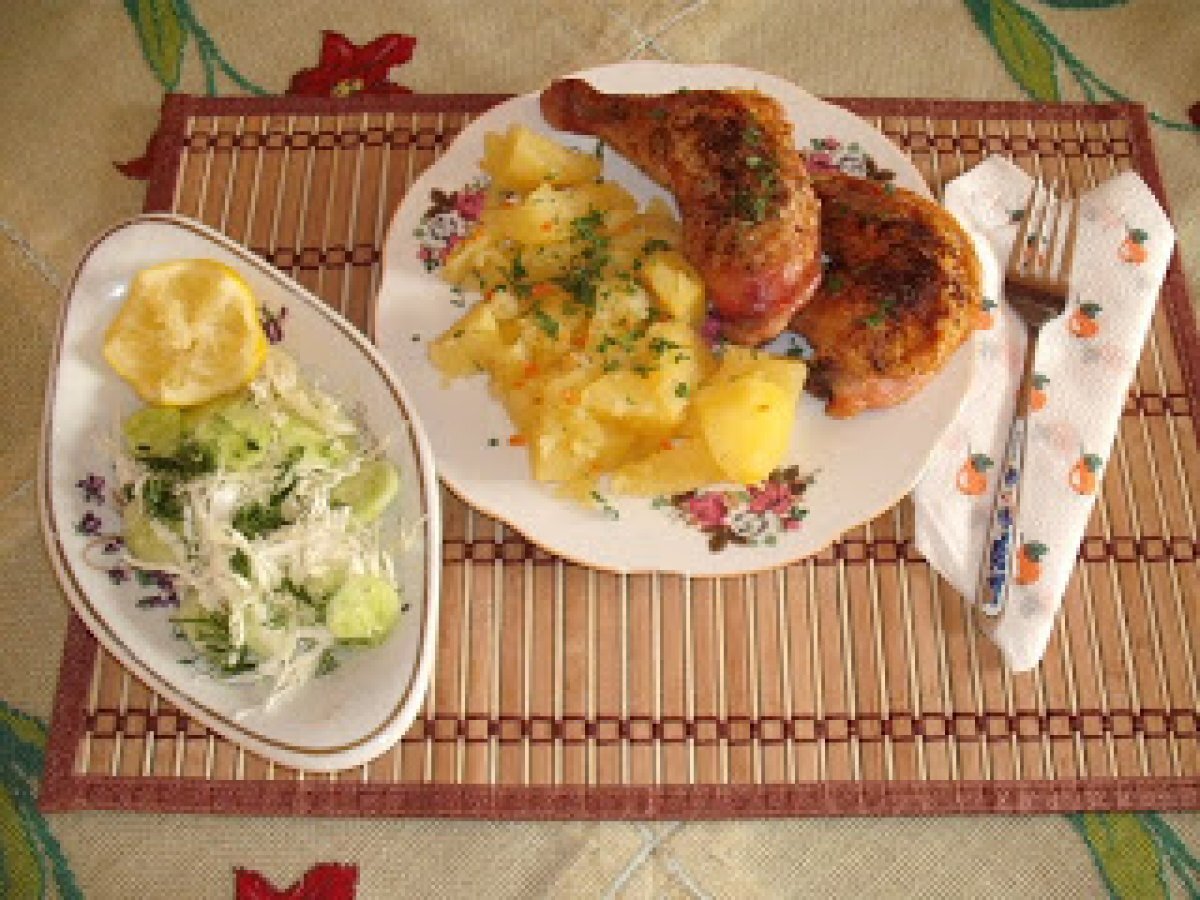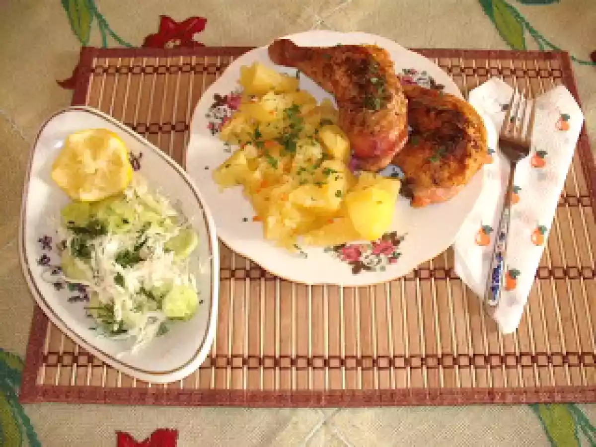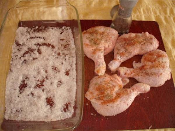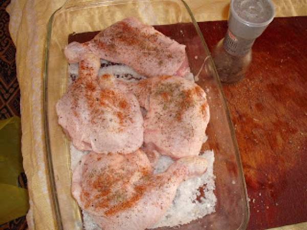 Pulpe pe pat de sare grunjoasa cu cartofi natur Felul principalFoarte ușor50 min Trimite unui prieten Printează pagina Adresează o întrebare autorului Postează o poză cu rețeta gătită de tine Ingrediente 2 4 pulpe de pui condimente piper o mana de sare grunjoasa 6cartofi o lingutita legume deshidratate(delicat) verdeata o lingura de ulei de masline