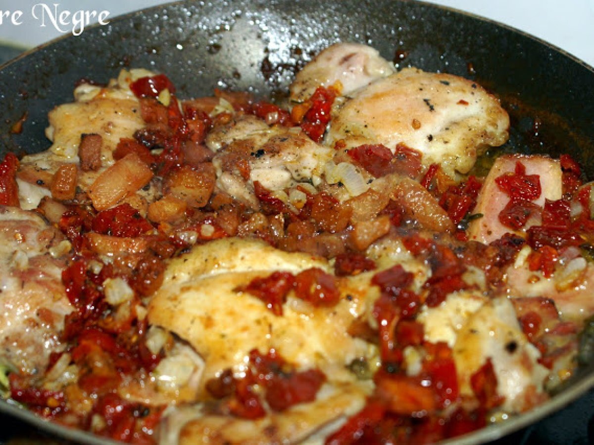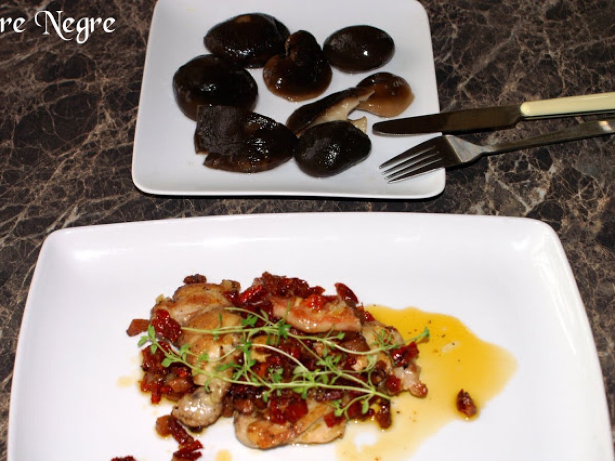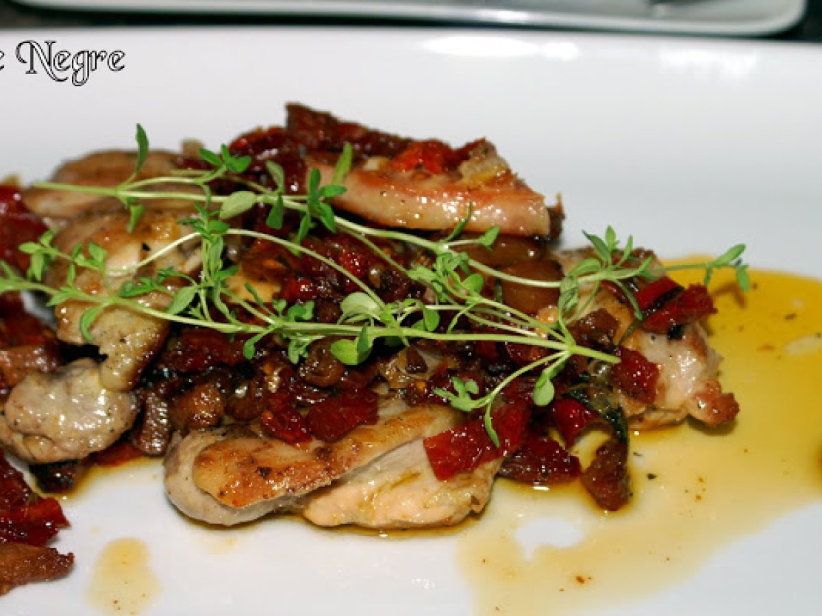 Pulpe superioare de pui cu rosii uscate si jumari PrecedentulUrmătorul Felul principalFoarte ușor55 min Trimite unui prieten Printează pagina Adresează o întrebare autorului Postează o poză cu rețeta gătită de tine Ingrediente 4 4 pulpe superioare de pui, dezosate si fara piele 8-10 bucati de rosii uscate[1], taiate in cubulete 100 g de sunculita afumata ½ de pahar de vin alb sec 1 ceapa verde , cu cap mare, asa cum se gaseste acum pe piata, tocata marunt cateva firicele de cimbru verde pentru prajit si ornat cateva ramurele de rozmarin 50 g de unt cateva ciuperci Shiitake, murate, din conserva[2] pentru servit sare si piper dupa gust