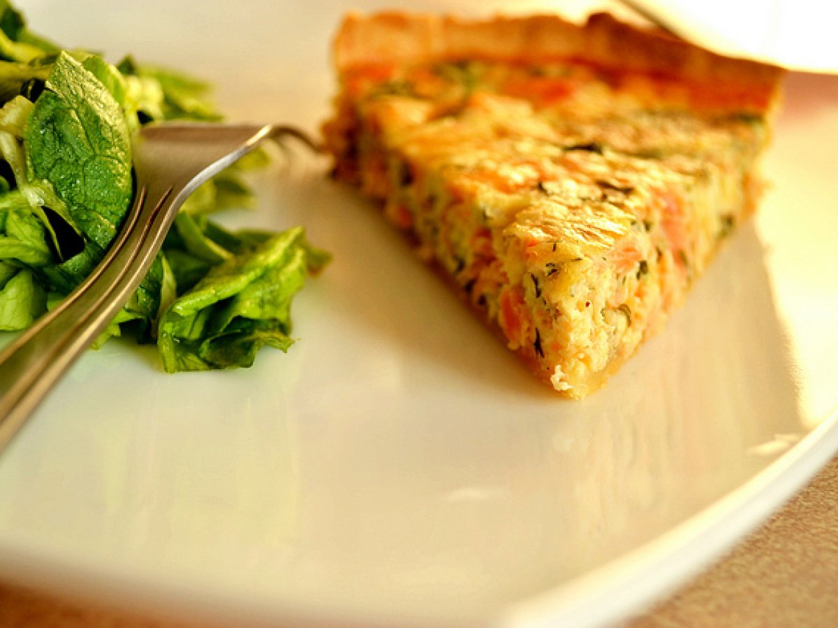 Quiche cu somon Felul principalFoarte ușor55 min Trimite unui prieten Printează pagina Adresează o întrebare autorului Postează o poză cu rețeta gătită de tine Ingrediente 6 175 g faina 75 g unt 15 g parmezar ras fin 3 linguri apa rece 200 g somon afumat 2 cepe verzi o legatura marar 3 oua 150 ml lapte 150 cheddar ras mare piper