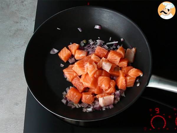 Incalziti uleiul de masline intr-o tigaie. Se taie ceapa marunt iar somonul se taie in bucati mari si se adauga in tigaie.