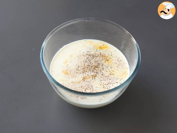 Într-un castron, amestecați smântâna, ouăle, sarea, piperul și nucșoara. La final, adaugați laptele.