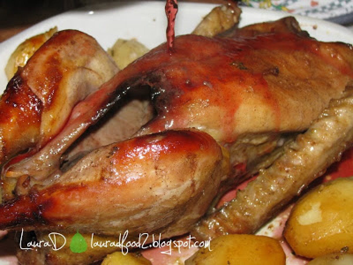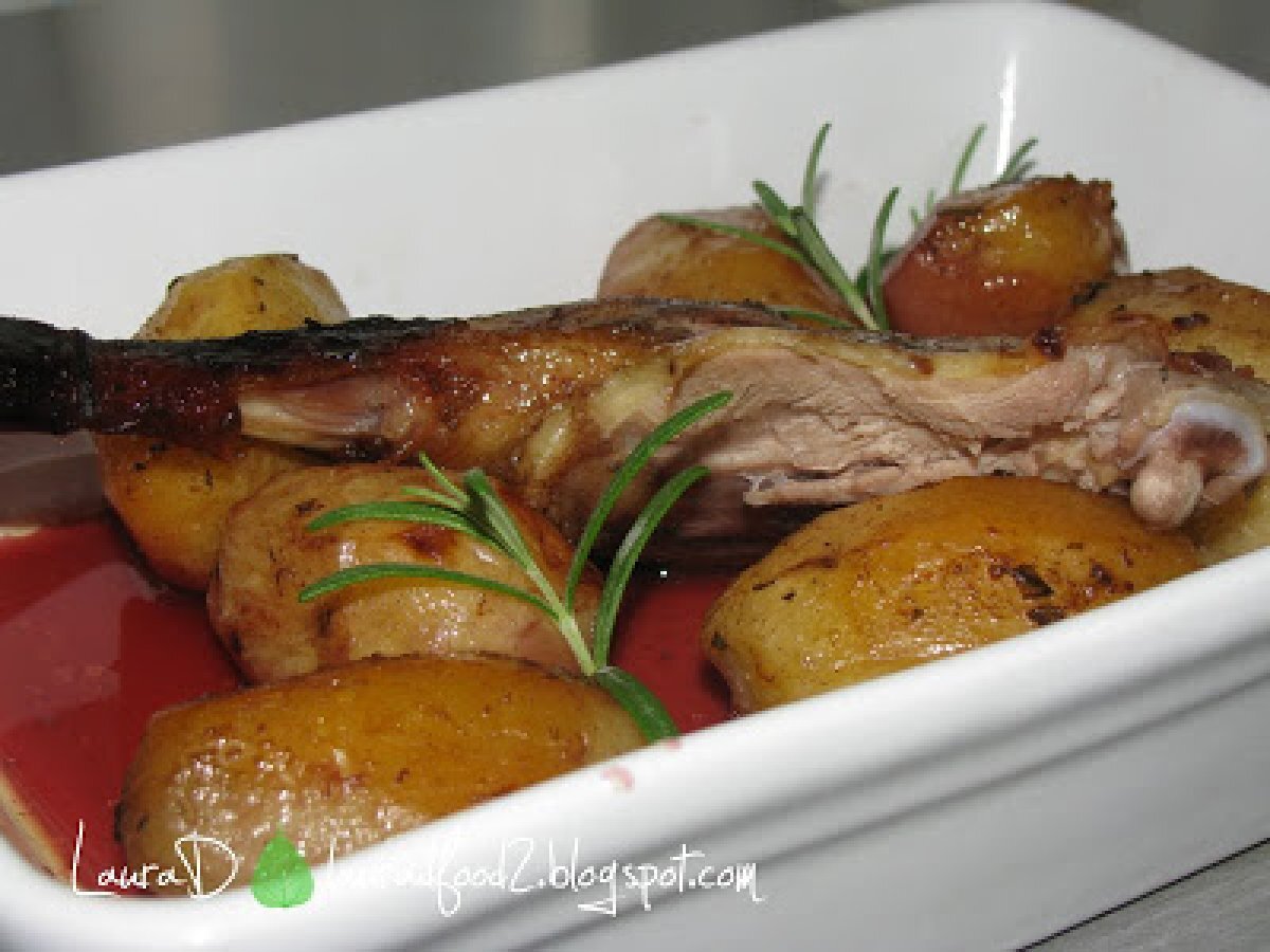 Rata aromata in sos de vin rosu PrecedentulUrmătorul Felul principalFoarte ușor1 h 50 m Trimite unui prieten Printează pagina Adresează o întrebare autorului Postează o poză cu rețeta gătită de tine Ingrediente 6 1 rata 2 linguri miere 1 lingurita melasa 4 linguri ulei de masline cu aroma de lamaie ½ lingurita scortisoara macinata sare de mare 2 crengute de rozmarin, frunzele rupte apoi tocate marunt 500 g cartofi noi, decojiti 375 ml vin rosu 2 linguri dulceata de trandafiri