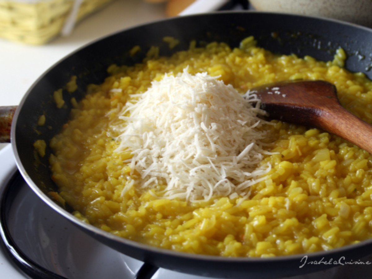 Risotto alla milanese PrecedentulUrmătorul Felul principalFoarte ușor35 min Trimite unui prieten Printează pagina Adresează o întrebare autorului Postează o poză cu rețeta gătită de tine Ingrediente 4 350 g orez pentru risotto 1 ceapa mica alba 50 g parmezan proaspat ras 1/2 pahar vin alb 50 g unt 1,5 l supa de legume 2 pliculete sofran