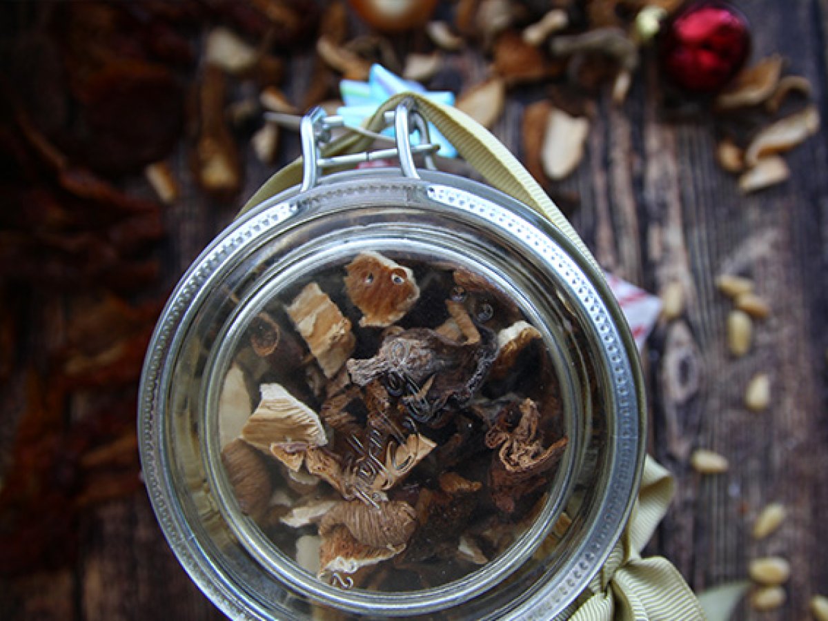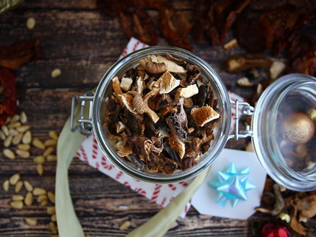 Taiați rosiile deshidratate si ciupercile deshidratate in bucati mici. Turanti orezul intr-un borcan, adaugati ierburile Provence, apoi rosiile uscate, apoi semintele de pin, apoi ciupercile. Inchideti borcanul.