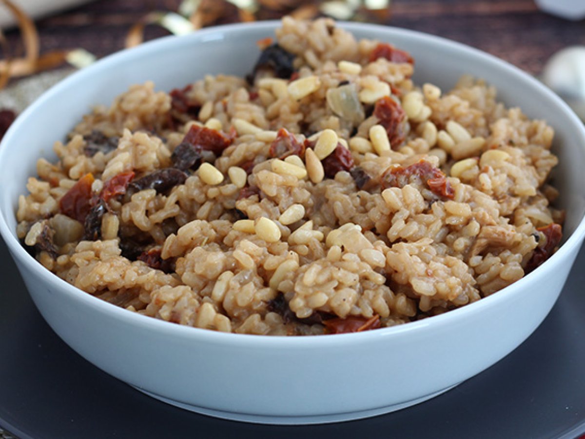 Risotto: Se taie o ceapa marunt si se caleste in ulei de masline. Cand devine translucida, se adauga continutul borcanului. Amestecati bine.
