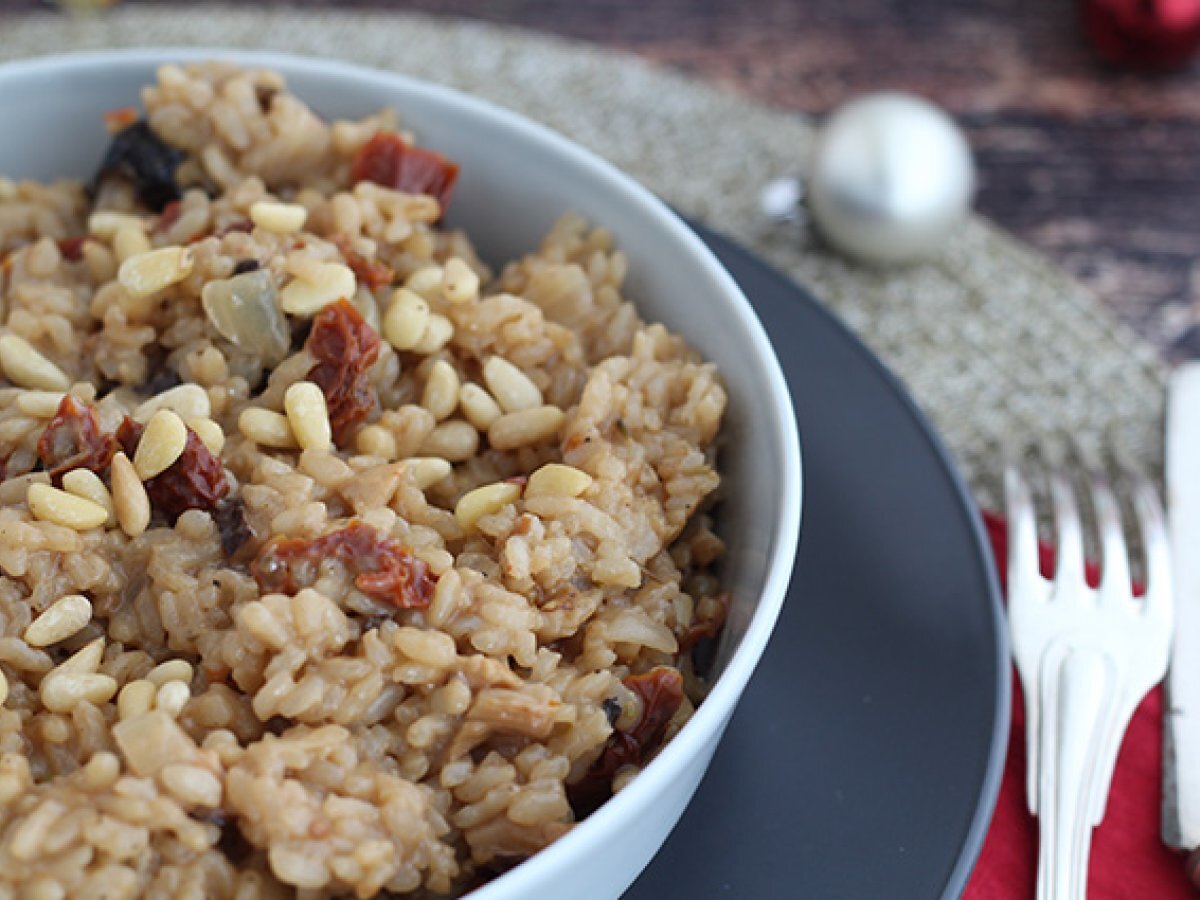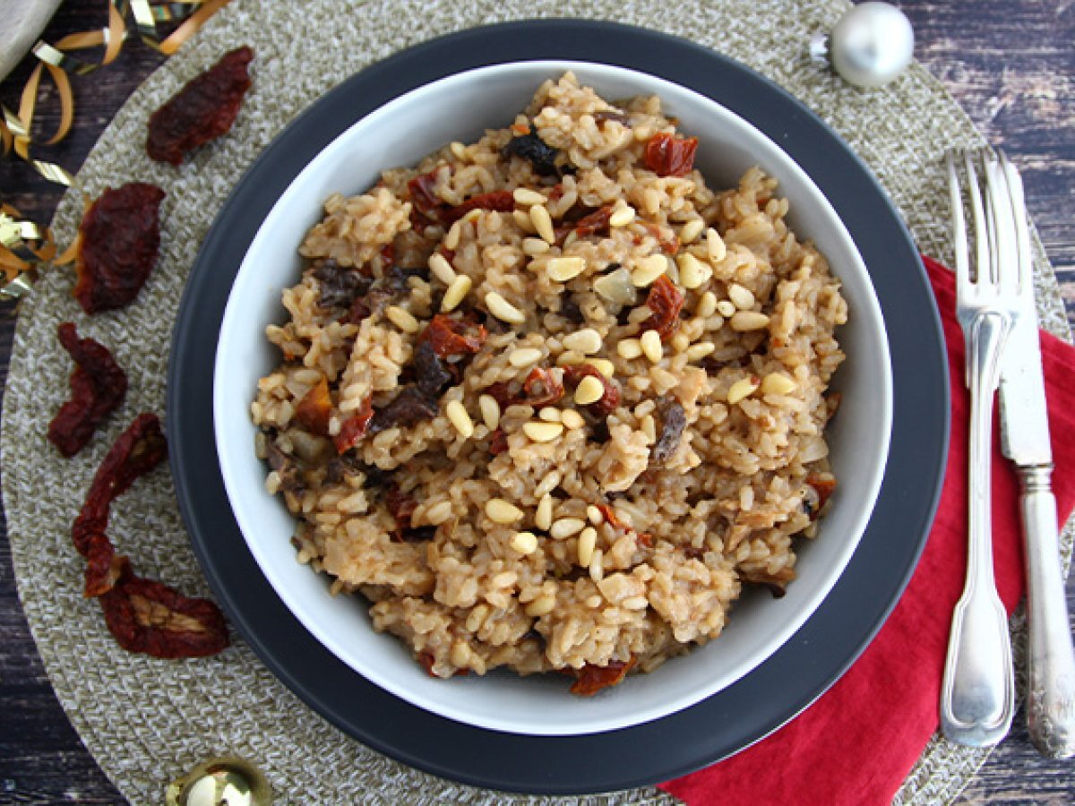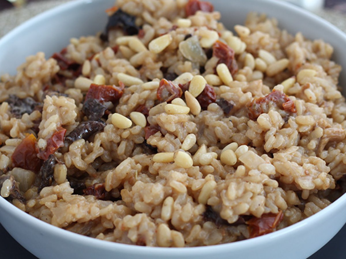 Doriti un fel de mancare usor de facut si reconfortant? Risotto va fi reteta perfecta ;-) O versiune vegetariana, garnisita cu rosii uscate si ciuperci si pentru o nota crocanta am adaugat seminte de pin. O reteta pentru intreaga familie.
