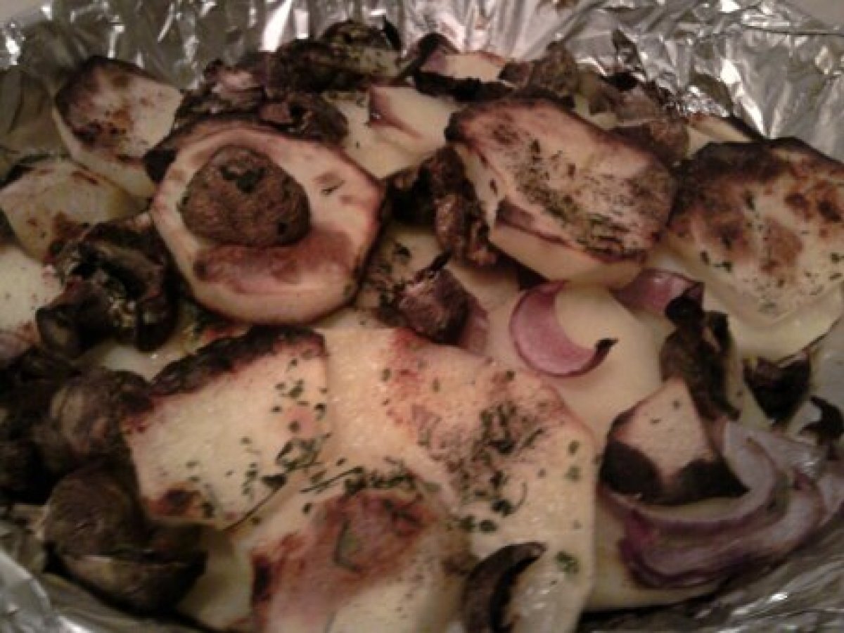 Rondele de cartofi la cuptor cu ceapa rosie si ciuperci PrecedentulUrmătorul Felul principalFoarte ușor40 min Trimite unui prieten Printează pagina Adresează o întrebare autorului Postează o poză cu rețeta gătită de tine Ingrediente 2 3-4 cartofi mari 2 cepe rosii potrivite 300 g ciuperci proaspete, champignon 2-3 fire patrunjel 2-3 linguri ulei sare piper boia de ardei dulce.