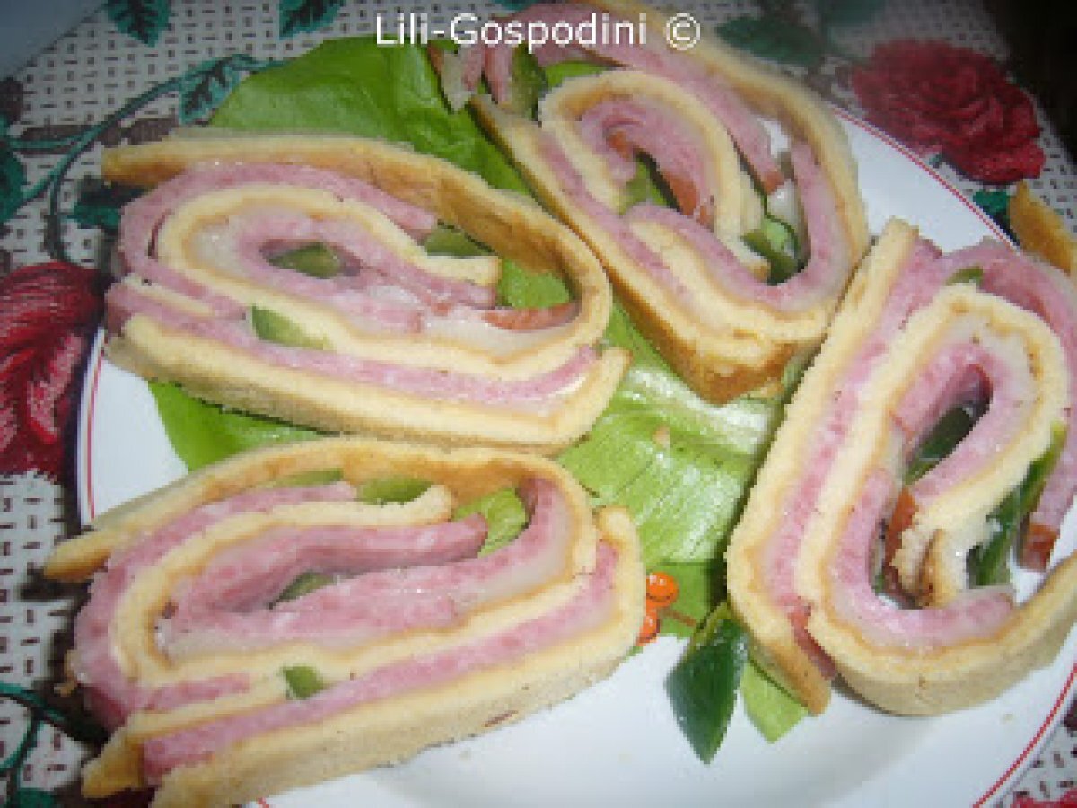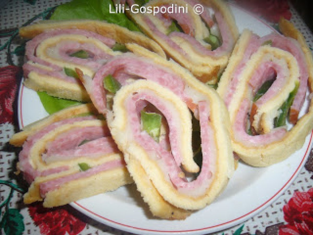 Rulada cu cascaval si sunca PrecedentulUrmătorul Felul principalFoarte ușor30 min Trimite unui prieten Printează pagina Adresează o întrebare autorului Postează o poză cu rețeta gătită de tine Ingrediente 6 Pentru blat: 3 linguri de faina 3 linguri de smantana 3 oua Umplutura: 50 g.unt 150 g.cascaval 6 felii sunca castravete murat jumatate de gogosar murat