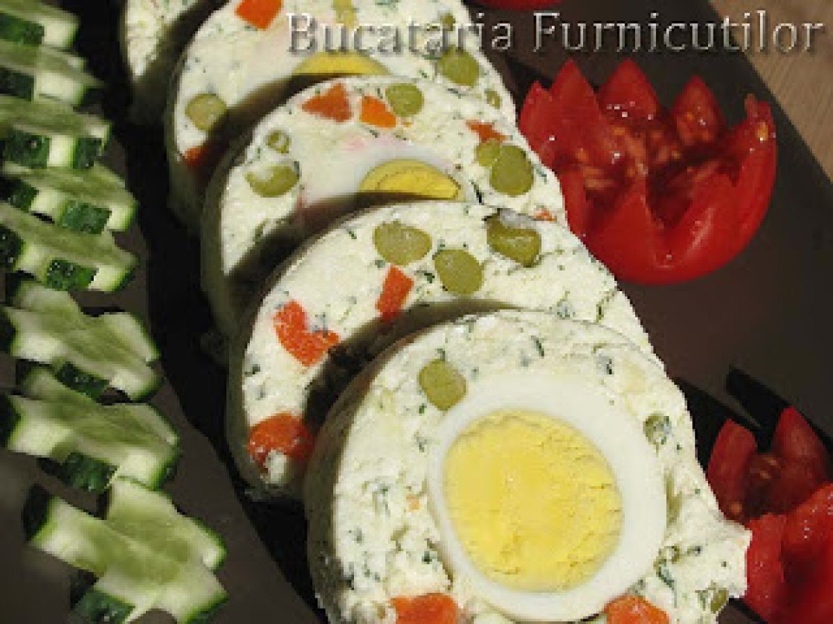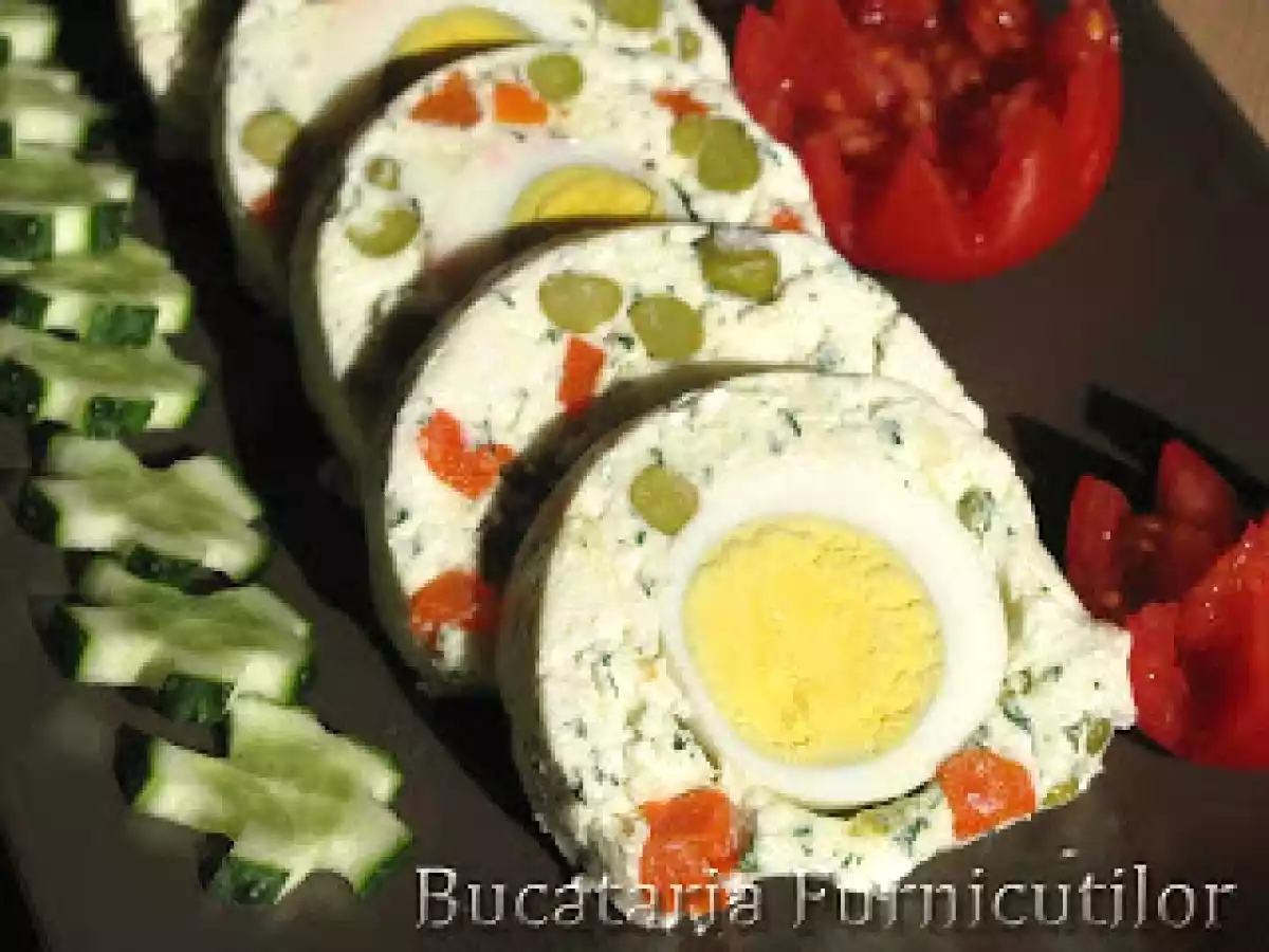 Rulada de branza cu oua PrecedentulUrmătorul Felul principalFoarte ușor45 min Trimite unui prieten Printează pagina Adresează o întrebare autorului Postează o poză cu rețeta gătită de tine Ingrediente 6 200 g branza dulce degresata 150 g branza de burduf 150 g telemea 100 g unt la temperatura camerei 3 - 4 oua fierte o conserva mica de morcov si mazare 1 legatura marar