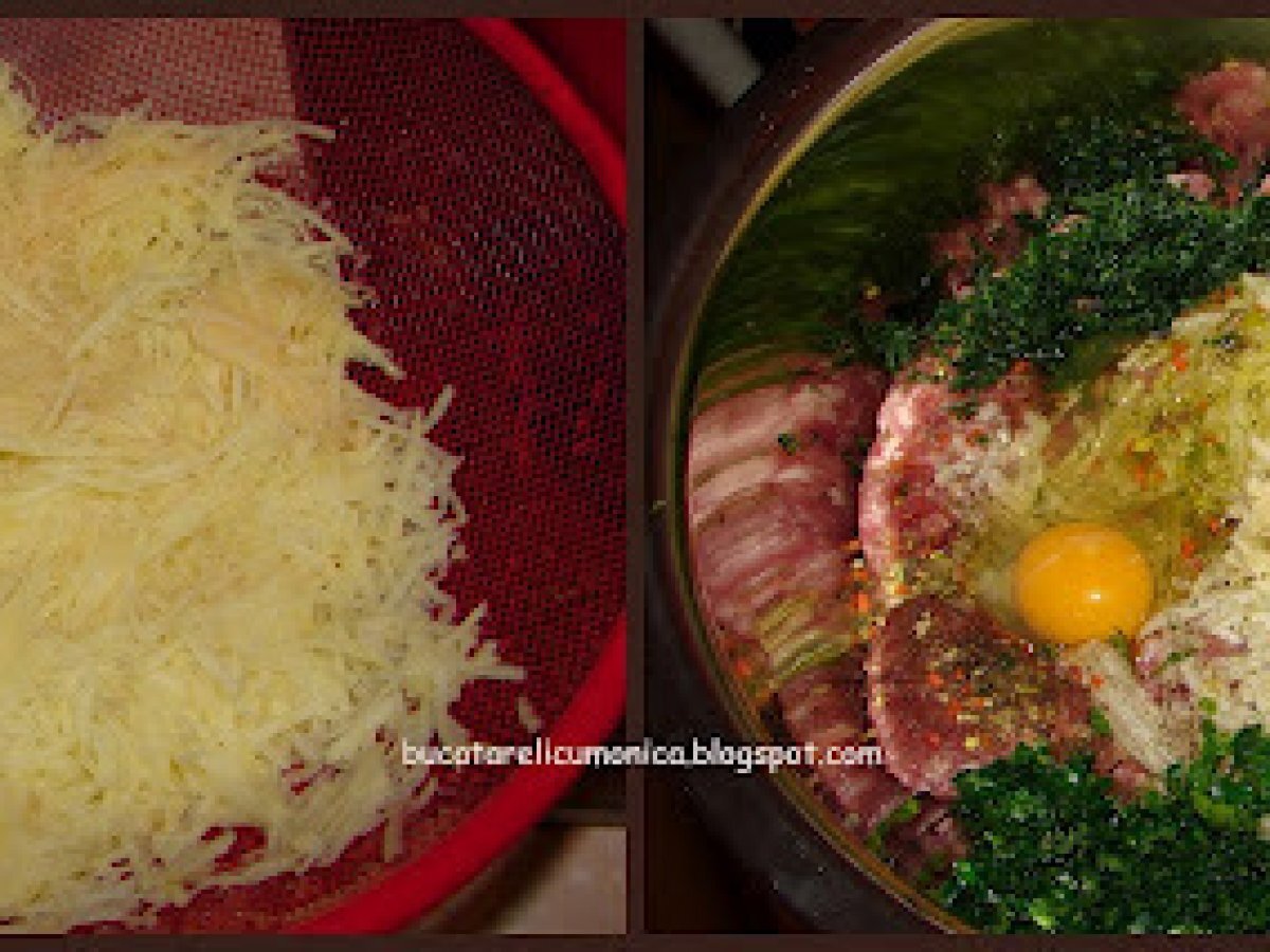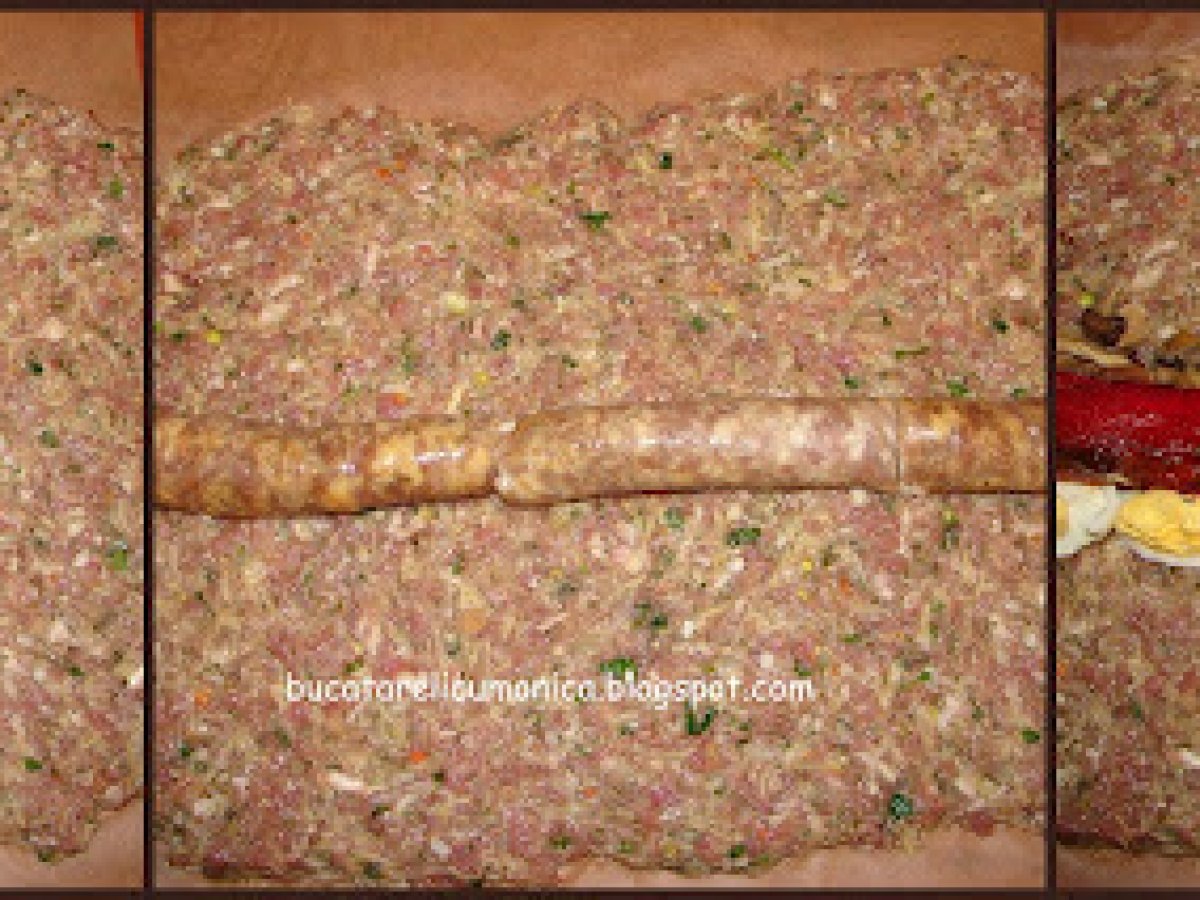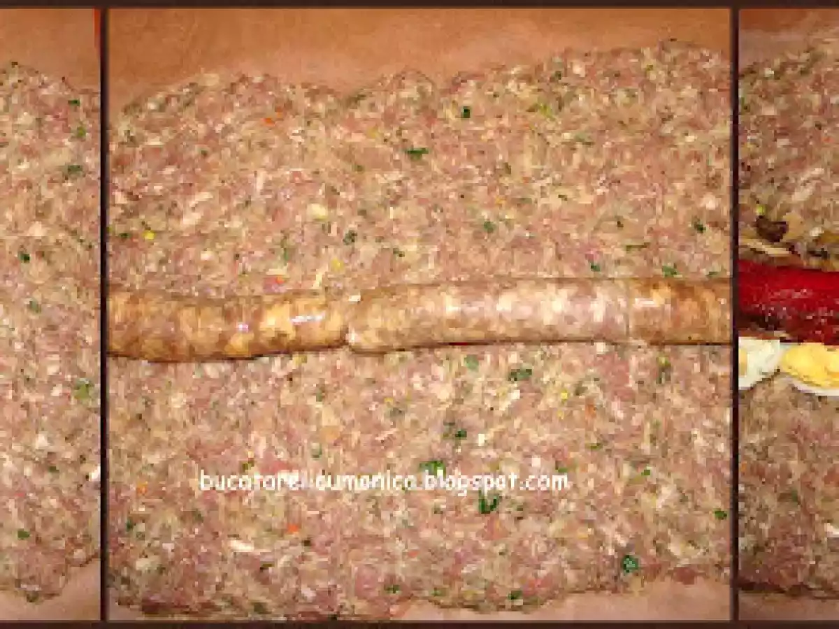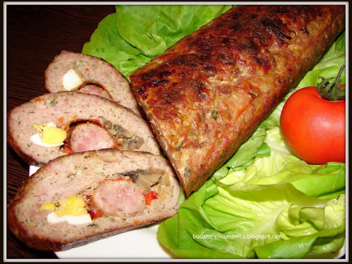 Rulada de carne tocata PrecedentulUrmătorul Felul principalUșor2 ore Trimite unui prieten Printează pagina Adresează o întrebare autorului Postează o poză cu rețeta gătită de tine O reteta noua, care a fost pe placul intregii familii Ingrediente 6 750 gr carne tocata de porc 2 3 ardei copti 1 ceapa mare 1/2 conserva de ciuperci 3 4 catei de usturoi 2 cartofi 2 felii de paine (franzela) 1 legatura de marar 1 legatura de patrunjel 1 ou crud 2 3 oua fierte carnaciori sare piper