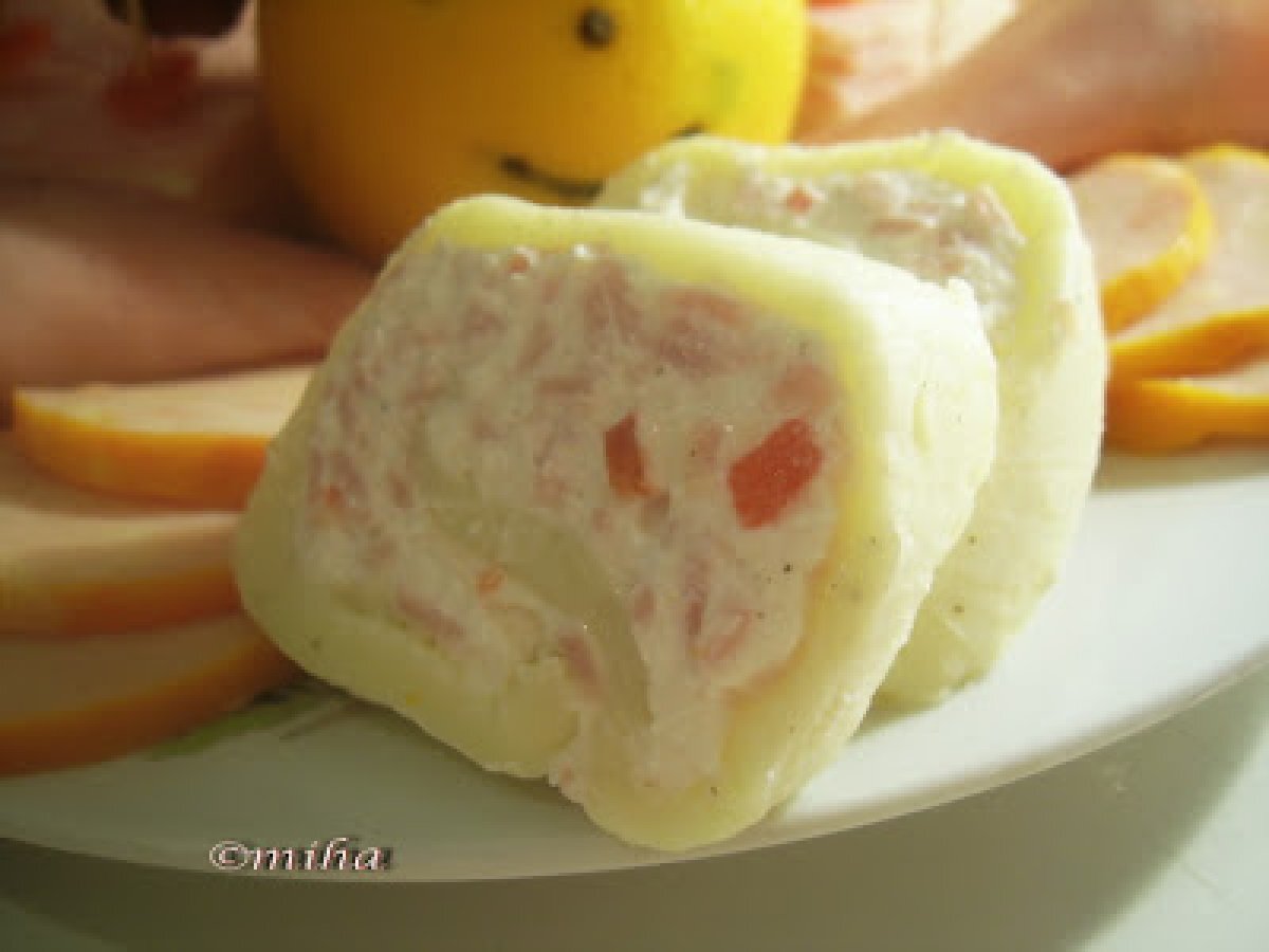 Rulada de cascaval cu branza si sunca PrecedentulUrmătorul Felul principalFoarte ușor50 min Trimite unui prieten Printează pagina Adresează o întrebare autorului Postează o poză cu rețeta gătită de tine Ingrediente 4 150 g cascaval 50 g unt Pentru umplutura: 250 g branza de vaci 100 g sunca 1/2 ardei gras rosu sare si piper
