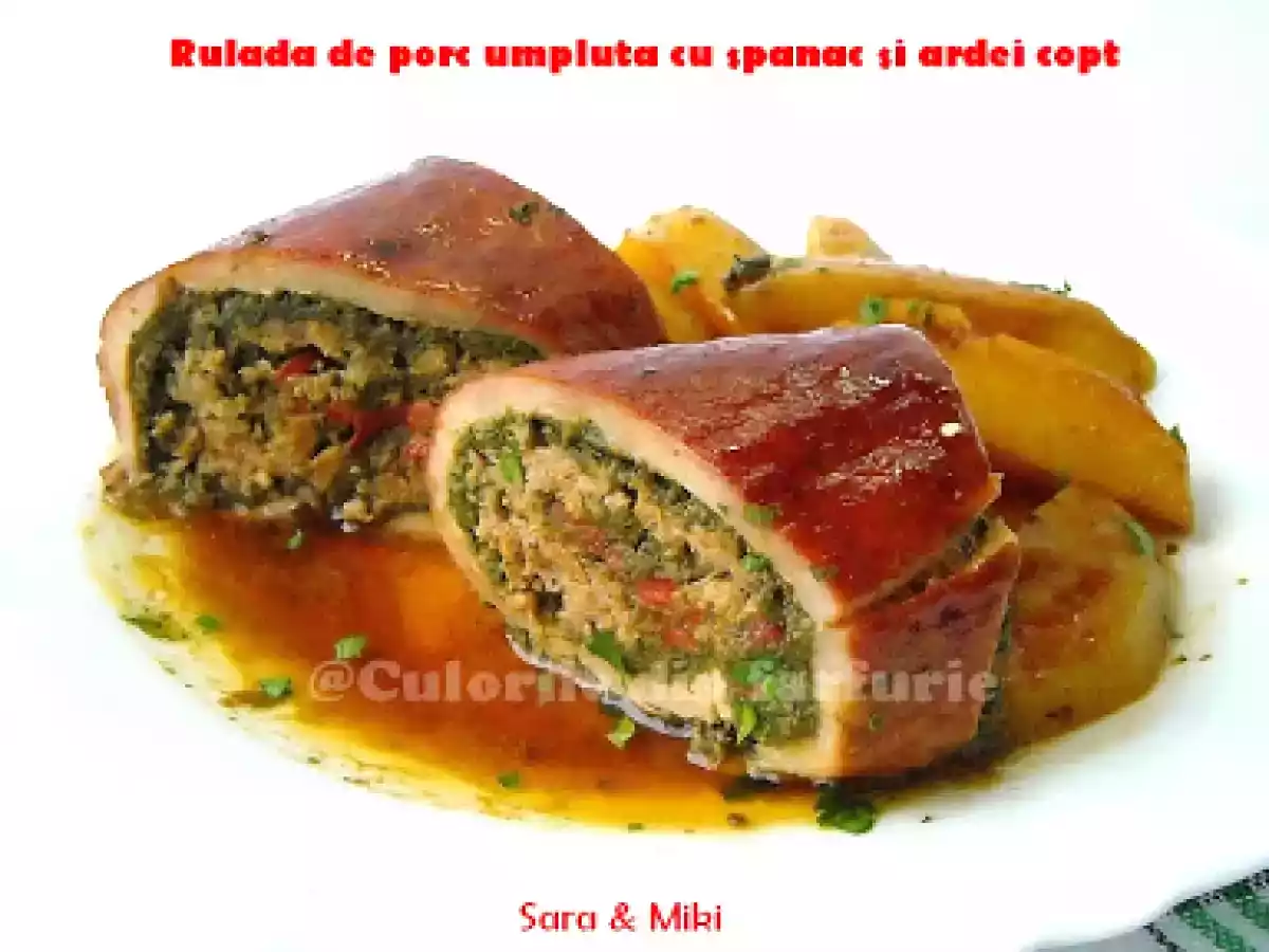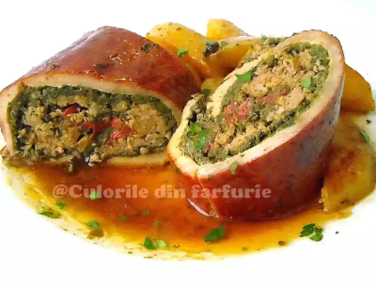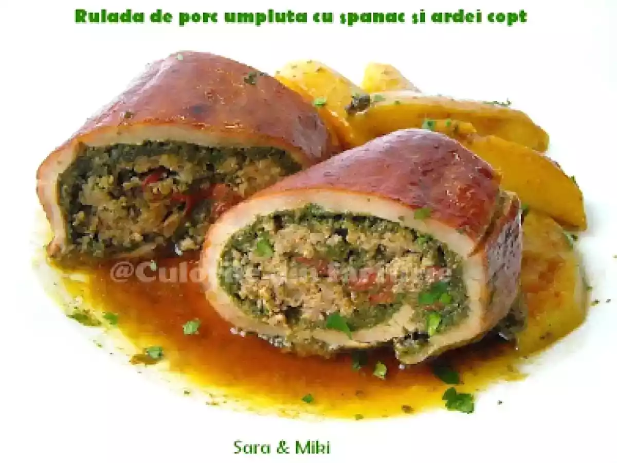 Rulada de porc umpluta cu spanac si ardei copti PrecedentulUrmătorul Felul principalFoarte ușor55 min Trimite unui prieten Printează pagina Adresează o întrebare autorului Postează o poză cu rețeta gătită de tine Ingrediente 4 700-800 g pulpa de porc 250 g carne tocata amestec 250 g spanac tocat fin 2-3 ardei rosu copti 2-3 linguri de mustar legatura de patrunjel tocat 1 lg pasta de tomate miere sare piper ulei de masline