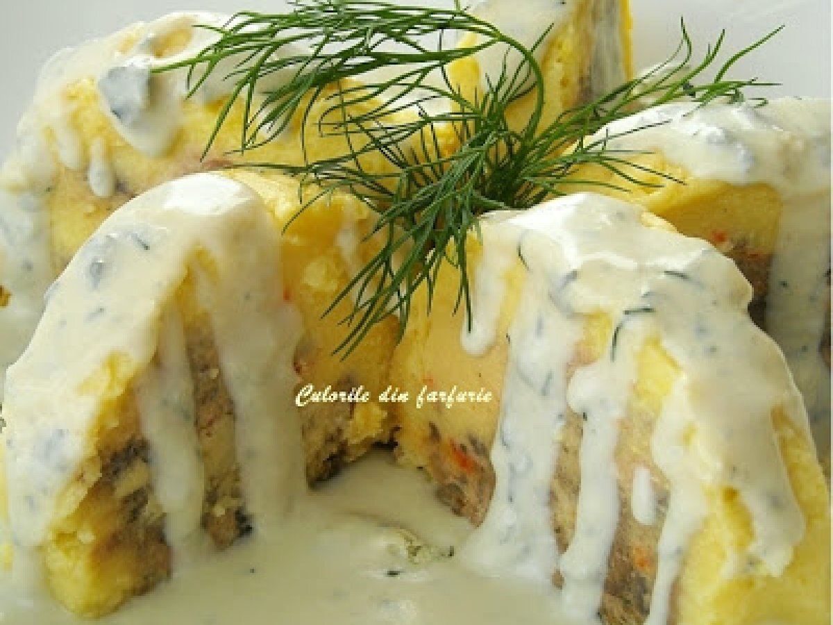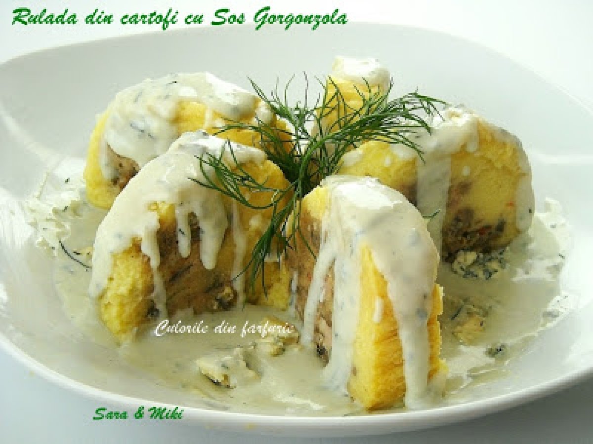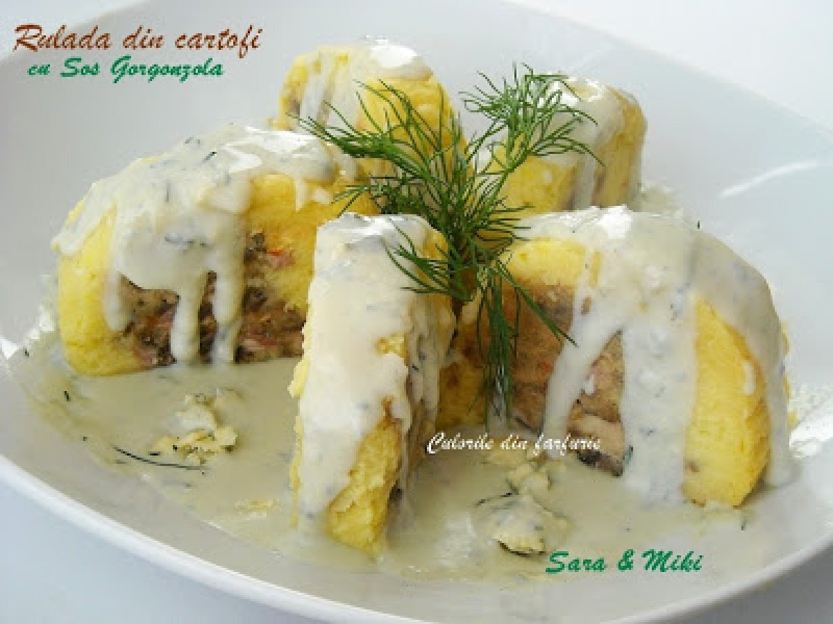 Rulada din cartofi cu sos gorgonzola PrecedentulUrmătorul Felul principalFoarte ușor45 min Trimite unui prieten Printează pagina Adresează o întrebare autorului Postează o poză cu rețeta gătită de tine Ingrediente 2 700 g cartofi 2 galbenusuri de o 20 g faina nucsoara Umplutura: 200 g. carnati de casa 150 g ciuperci 1/2 ardei rosu 1 catel de usturoi sare piper verdeturi proaspete tocate fin Sosul gorgonzola: 50 ml smantana 50 ml vin alb 120 g branza gorgonzola piper sare