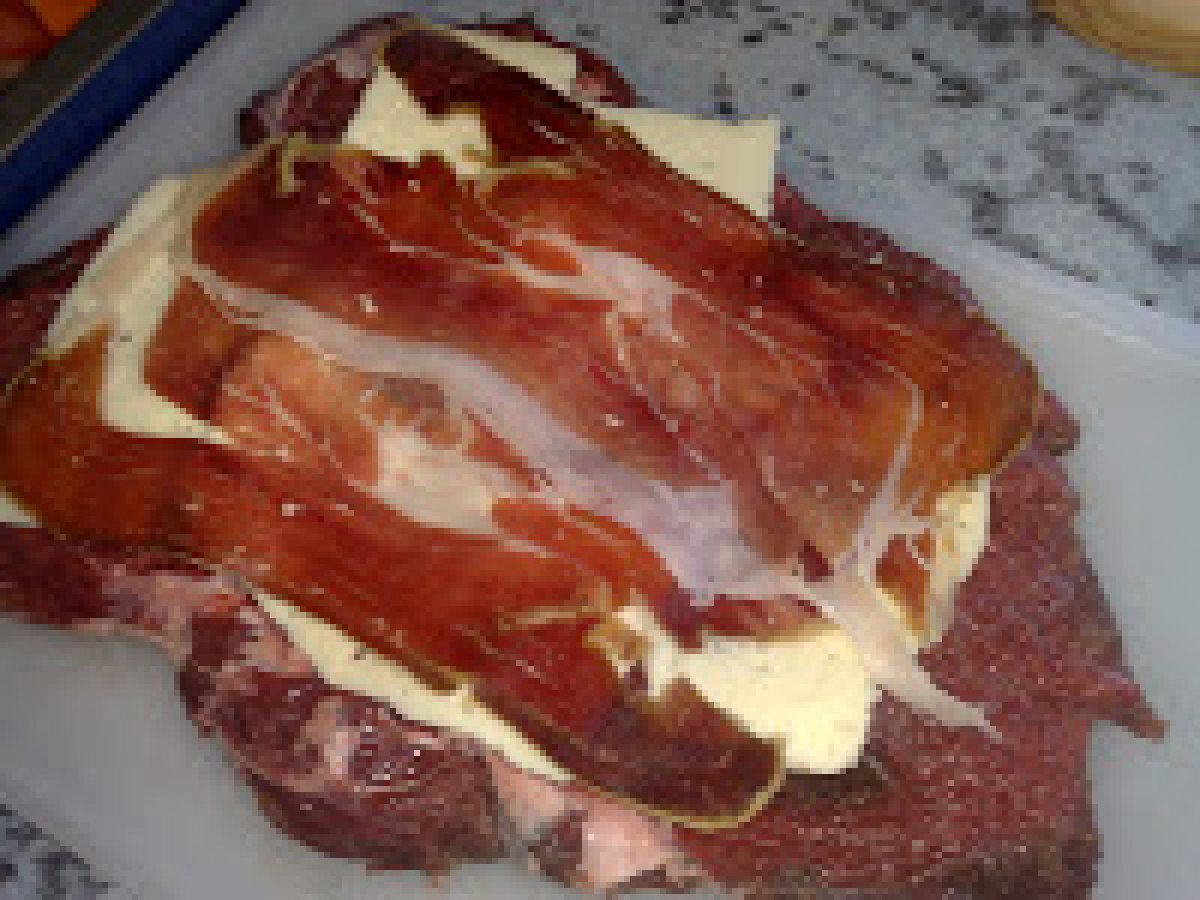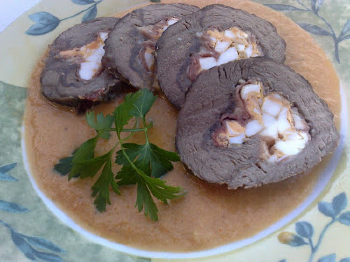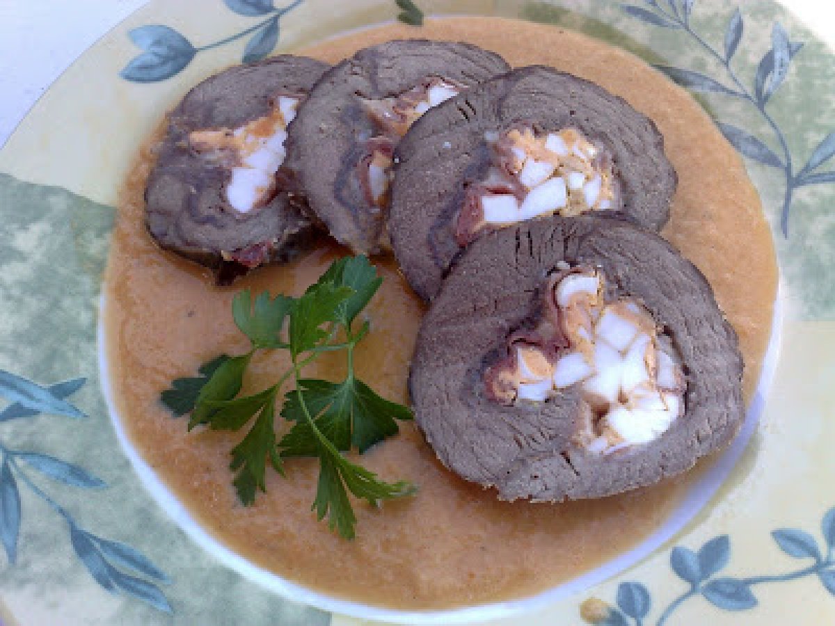 Rulada din muschi de vita cu sos de legume PrecedentulUrmătorul Felul principalFoarte ușor1 h 30 m Trimite unui prieten Printează pagina Adresează o întrebare autorului Postează o poză cu rețeta gătită de tine Ingrediente 6 600 g muschi de vita 200 g cascaval felii 2 oua fierte 150 g jambon (prosciuto) sare ,piper 2 morcovi 2 cepe 1 rosie 1 pahar vin alb 3 catei usturoi 50 ml ulei