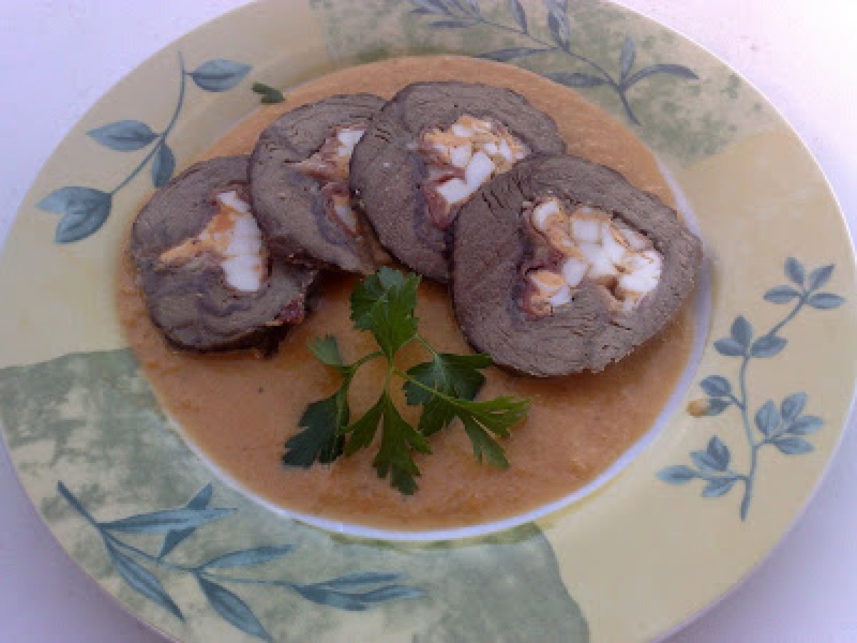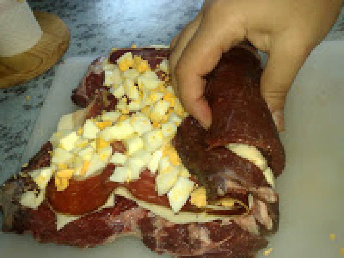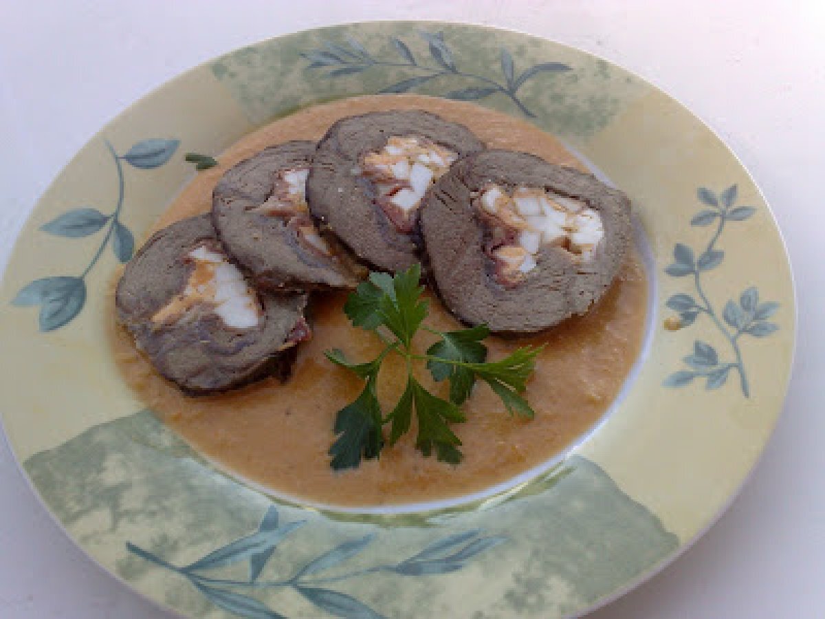 Rulada din muschi de vita cu sos de legume PrecedentulUrmătorul Felul principalFoarte ușor1 h 30 m Trimite unui prieten Printează pagina Adresează o întrebare autorului Postează o poză cu rețeta gătită de tine Ingrediente 4 600 g muschi de vita 200 g cascaval felii 2 oua fierte 150 g jambon (prosciuto) sare ,piper 2 morcovi 2 cepe 1 rosie 1 pahar vin alb 3 catei usturoi 50 ml ulei