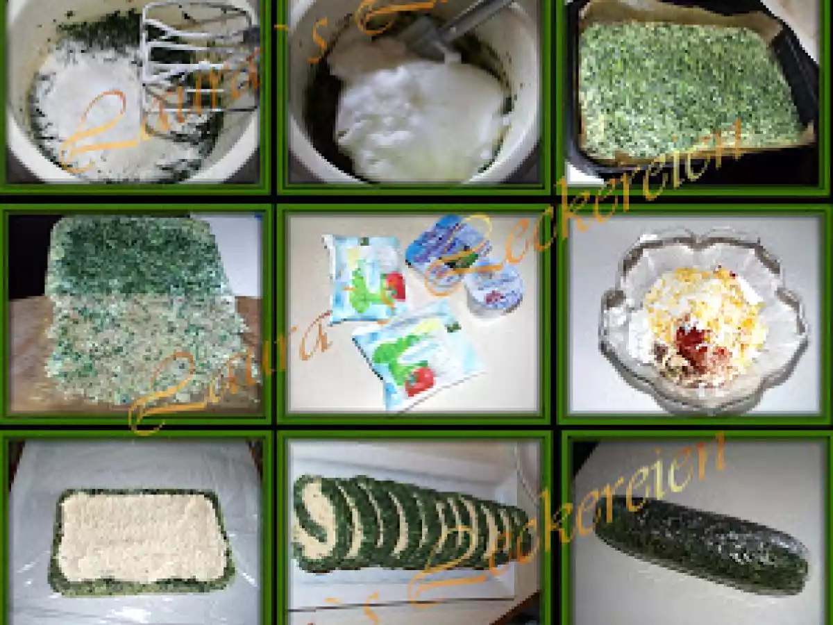 Rulada din spanac cu crema de brinza mozzarella / spinat-biskuitrolle mit mozzarella PrecedentulUrmătorul Felul principalFoarte ușor1 h 20 m Trimite unui prieten Printează pagina Adresează o întrebare autorului Postează o poză cu rețeta gătită de tine Ingrediente 4 INGREDIENTE-BLAT: 4 albusuri de ou batute spuma cu 1 prinza de sare 4 galbenusuri 300 g spanac congelat tocat marunt, dezghetat si bine scurs 100 g de simtina groasa sau Creme Fraiche 75 g faina 1 lc praf de copt sare, piper,nucsoara si ceva usturoi granulat INGREDIENTE-UMPLUTURA: 75 g smintina groasa sau creme fraiche 200 g brinza proaspata bine scursa de ex. Cottage Käse 2 oua fierte tari si taiate bucatele marunte 2 bucati rotunde de mozzarella taiate la fel in cuburi marunte sare, piper, ceva boia de ardei dulce si usturoi granulat
