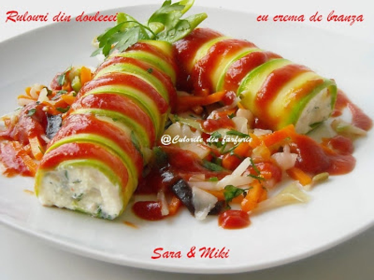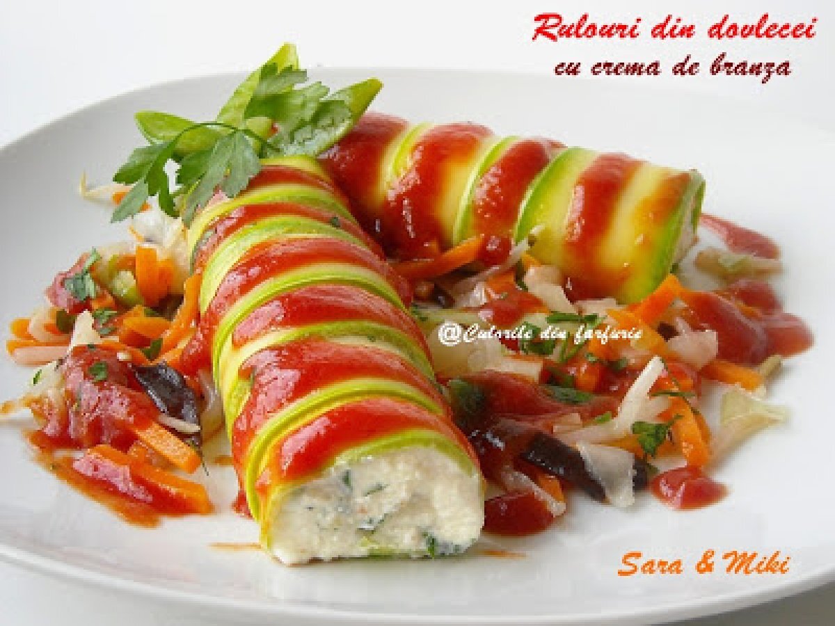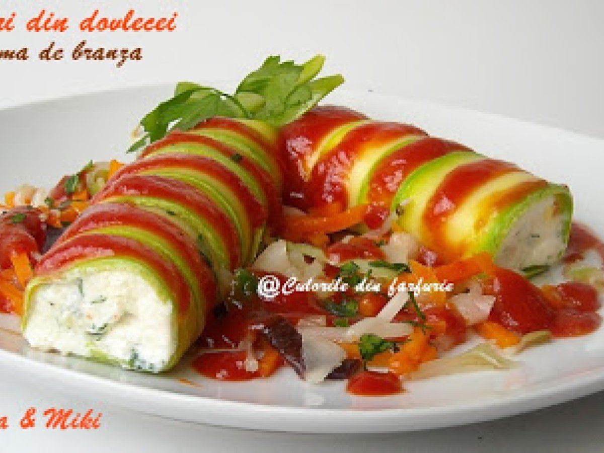 Rulouri din dovlecei cu crema de branza PrecedentulUrmătorul Felul principalFoarte ușor50 min Trimite unui prieten Printează pagina Adresează o întrebare autorului Postează o poză cu rețeta gătită de tine Ingrediente 6 2-3 dovlecei 200 g. crema de branza 100 g. telemea 80 g. de unt ceapa verde 2-3 lg smantana 1/2 ardei rosu 1/2 ardei galben sos de rosii marar patrunjel sare piper