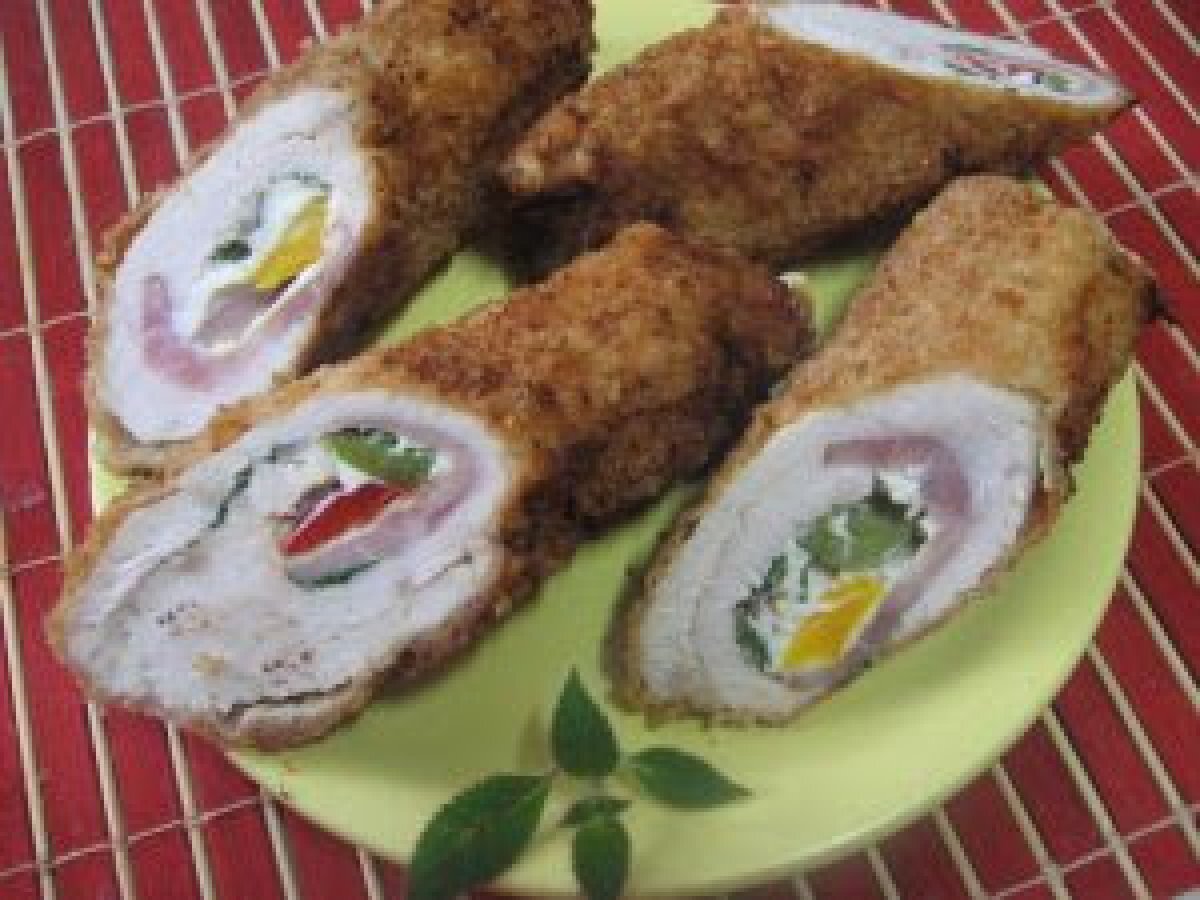 Rulouri din piept de curcan cu sunca in sos de rodii PrecedentulUrmătorul Felul principalFoarte ușor45 min Trimite unui prieten Printează pagina Adresează o întrebare autorului Postează o poză cu rețeta gătită de tine Ingrediente 4 700 g piept de curcan 2 rodii 1/2 pahar sirop de rodii sau de zmeura 1/2 pahar vin rosu 1 varf cutit scortisoara frunze patrunjel verde 2 oua 100 g pesmet 100 g migdale macinate 1 pachet branza Ementaler ulei ardei gras colorat