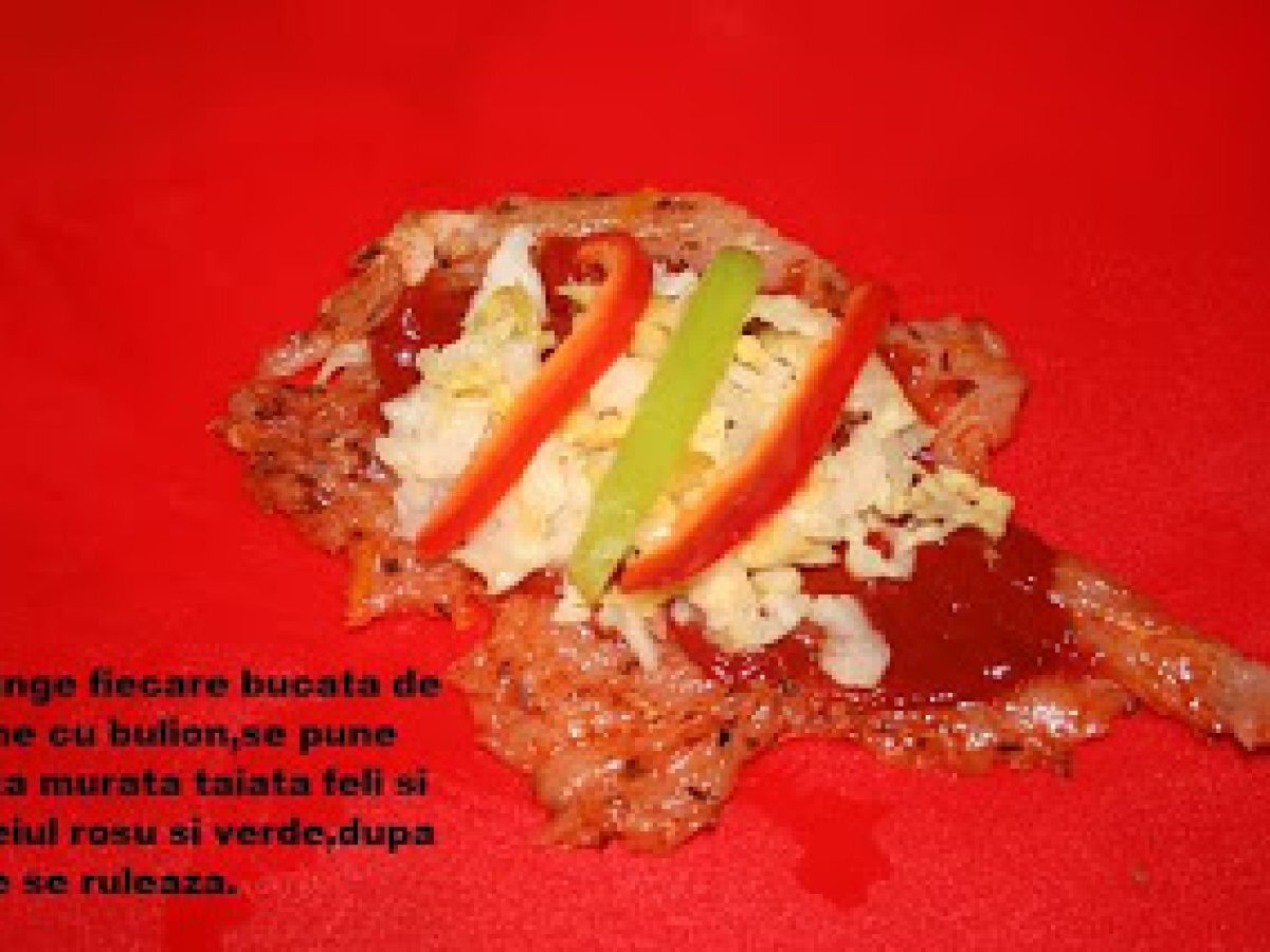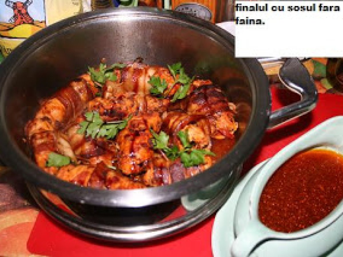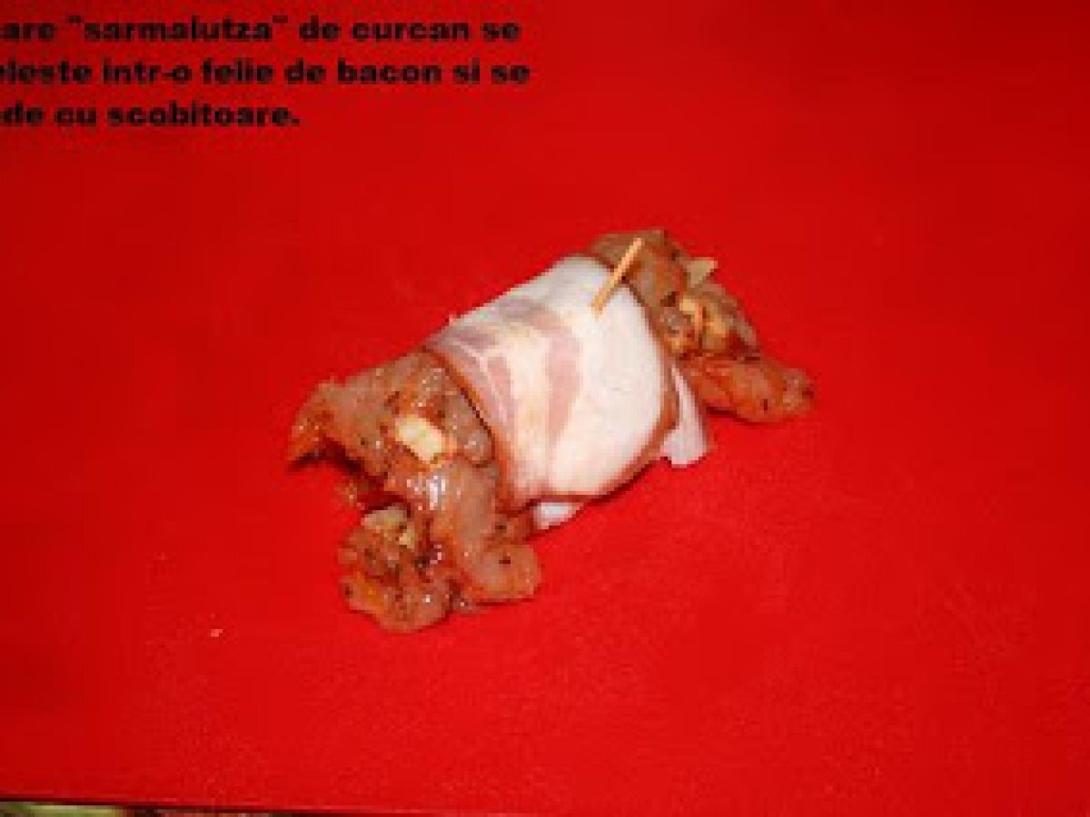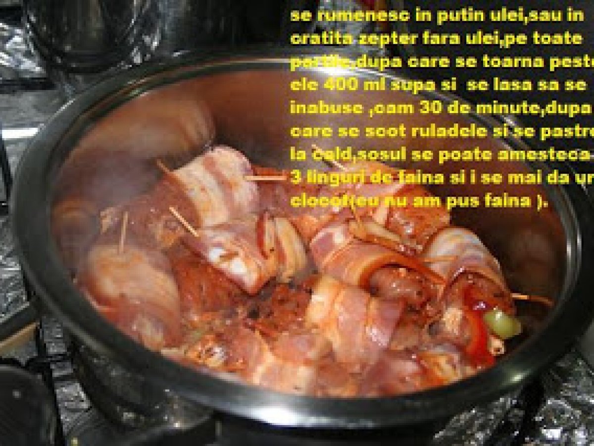 Rulouri din piept de curcan PrecedentulUrmătorul Felul principalFoarte ușor45 min Trimite unui prieten Printează pagina Adresează o întrebare autorului Postează o poză cu rețeta gătită de tine Ingrediente 2 1 piept de curcan filetat fin,subtire 10 linguri (Lg) de ulei 4 lingurite(lg) boia 4 lg chimen seminte 3 lg coaja rasa de lamaie 300 g varza acra taiata subtire 1 ardei rosu taiat fasii 1 ardei verde taiat fasii 6 inguri de bulion 600 ml supa de carne bacon felii sare piper 4 linguri de faina