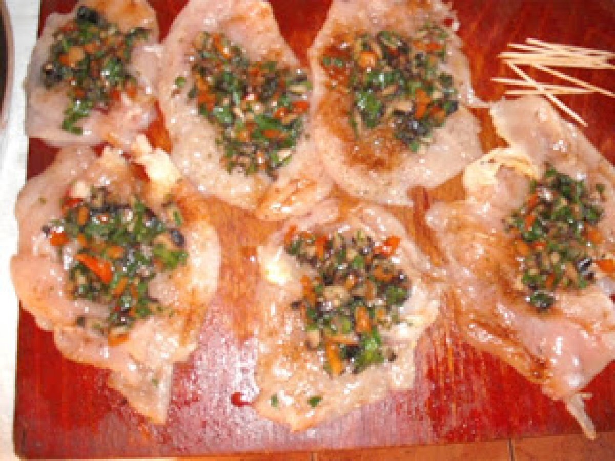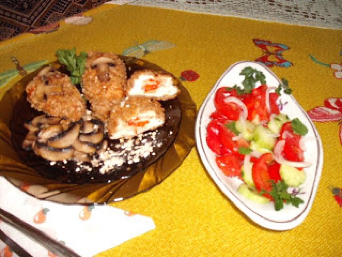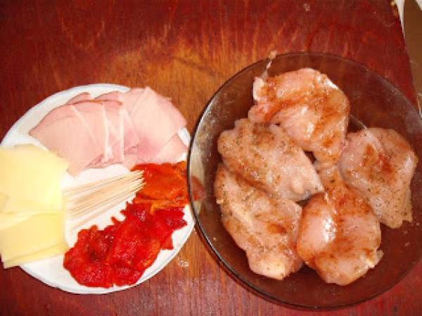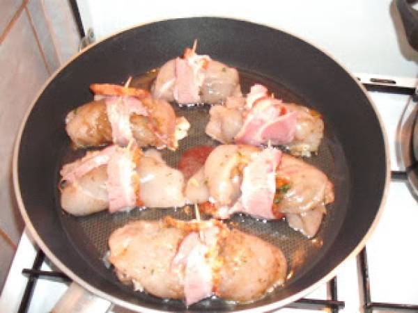 Rulouri din piept de pui PrecedentulUrmătorul Felul principalFoarte ușor25 min Trimite unui prieten Printează pagina Adresează o întrebare autorului Postează o poză cu rețeta gătită de tine Ingrediente 8 1 piept de pui mare dezosat o ceapa mica un ardei gras rosu 6-7 ciuperci mari patrunjel verde 2 lingurite delikat o lingurita condimente (maghiran,piper, busuioc,oregano,cimbrisor) 50 ml vin alb ulei scobitori de bambus cateva fasii de bacon afumat PORTOFELE CU SURPRIZE : un piept mare de pui, dezosat cca 150 g de fulgi de ovaz 100 g cascaval 100 g muschiulet afumat un ardei gras rosu(sau kapia) sare piper scobitori de bambus ulei pentru prajit 2 oua