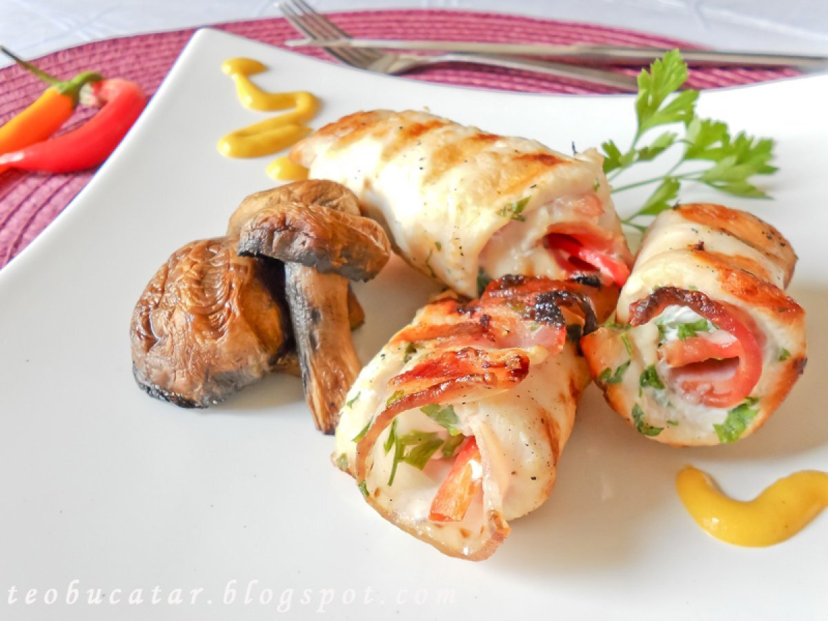 Rulouri picante de pui Felul principalUșor40 min Trimite unui prieten Printează pagina Adresează o întrebare autorului Postează o poză cu rețeta gătită de tine Ingrediente 3 3-400 g piept pui fara piele si os, 150-2oo g sunculita afumata, sare, piper alb macinat, o legatura de patrunjel verde, 2 ardei mici rosii si iuuti,