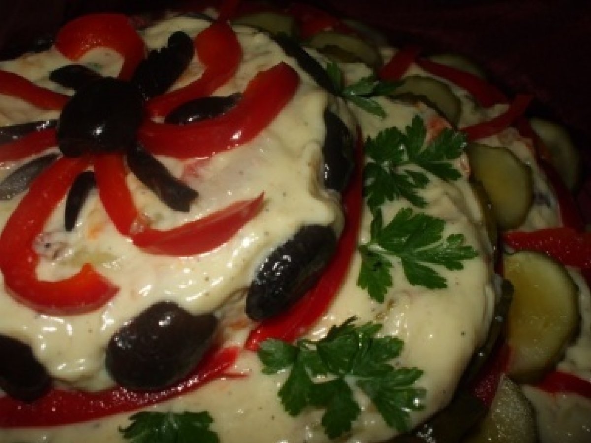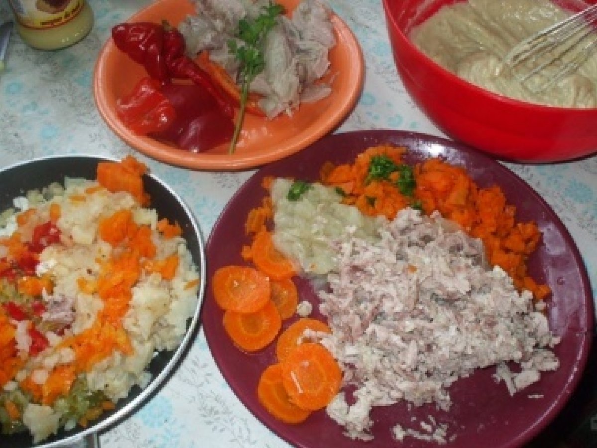 Salata boeuf cu curcan PrecedentulUrmătorul Felul principalFoarte ușor1 h 25 m Trimite unui prieten Printează pagina Adresează o întrebare autorului Postează o poză cu rețeta gătită de tine Ingrediente 4 1 pulpa superioara curcan fiarta in supa 1 morcov, 1 patrunjel, 1 ceapa, 100 g telina fierte in supa 4 cartofi roz potriviti 4 castraveti murati cateva bucati de gogosar murat 3 linguri de faina 1-2 oua 3 linguri de mustar cateva fire de patrunjel 50 ml ulei 5-6 masline negre sare, piper