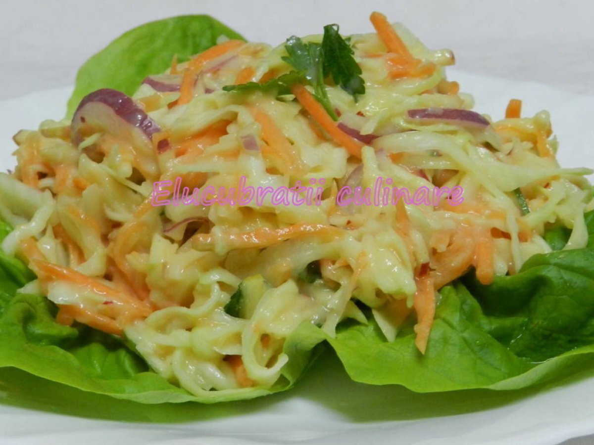 Cuvântul Coleslaw a intrat în limba engleză din limba olandeză în anii 1700 adică Koolsla înseamnă varză și SLA înseamnă salată. De atunci acest fel de salată este prezent aproape la fiecare picnic sau grătar.