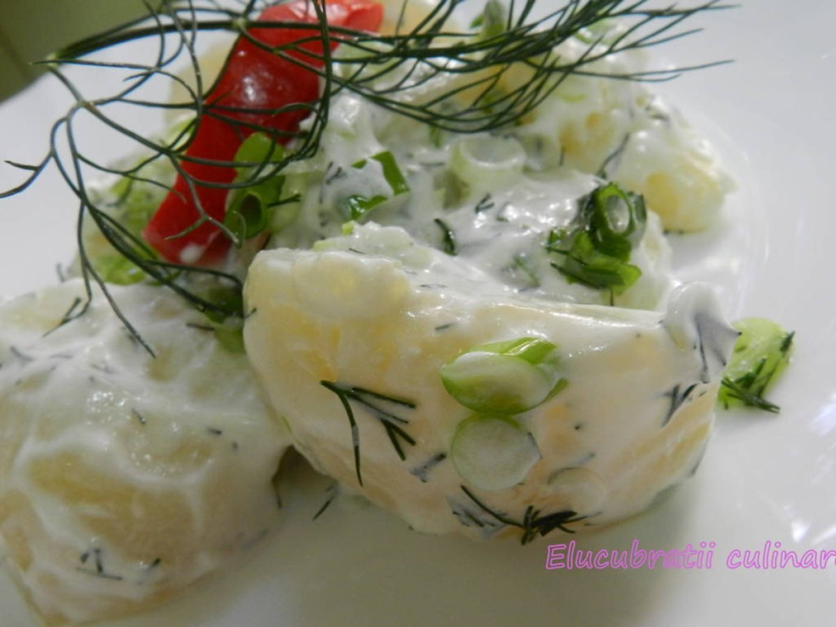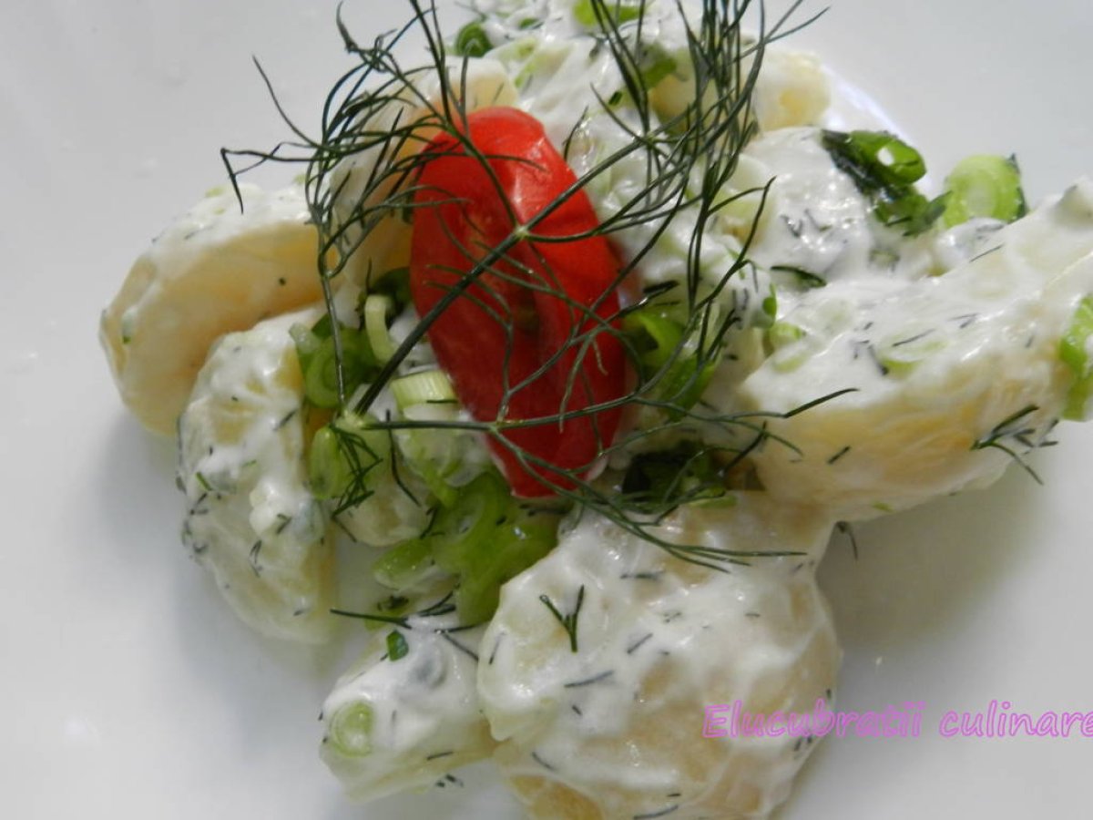 Salată de cartofi noi PrecedentulUrmătorul Felul principalFoarte ușor30 min438 Kcal Trimite unui prieten Printează pagina Adresează o întrebare autorului Postează o poză cu rețeta gătită de tine o garnitura minunata... pentru orice fripturica Ingrediente 4 1 kg cartofi noi, 4-5 fire ceapă verde, 2-3 căței usturoi, 1 legătură mărar, 200 g smântână, 2-3 linguri ulei, 2-3 linguri zeamă de lămâie, sare, piper.