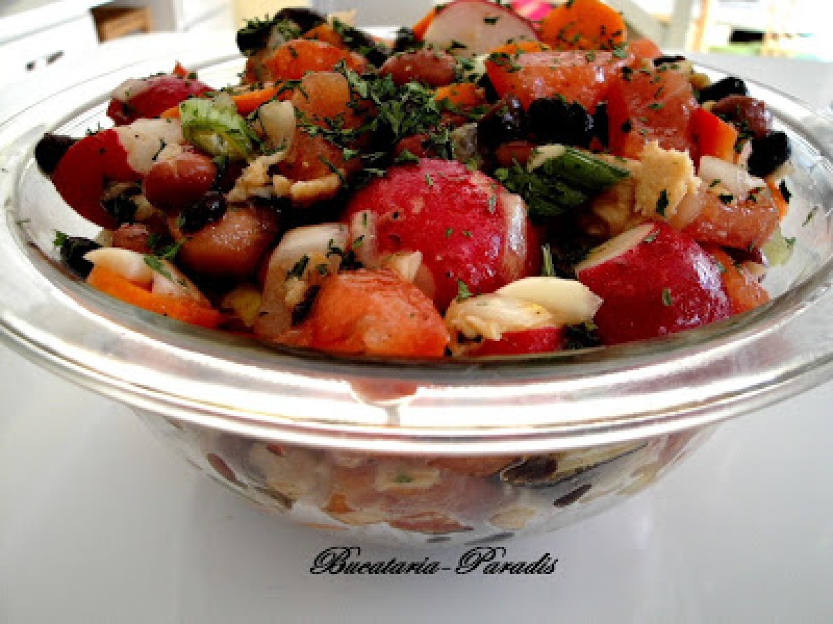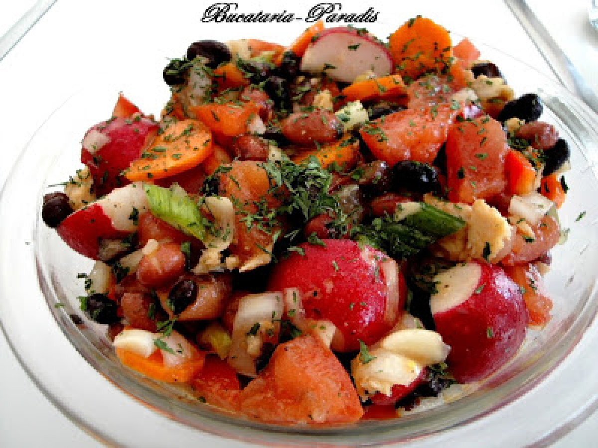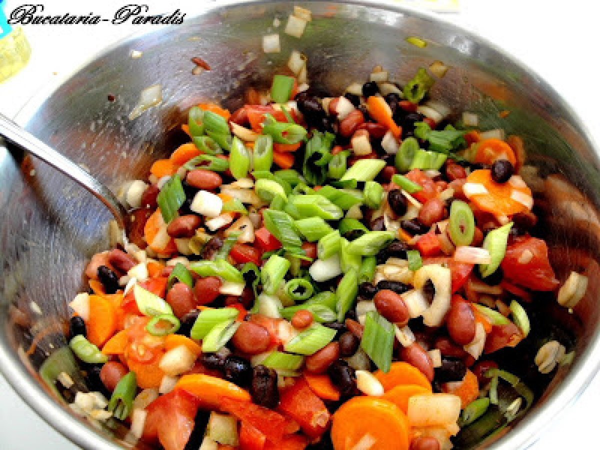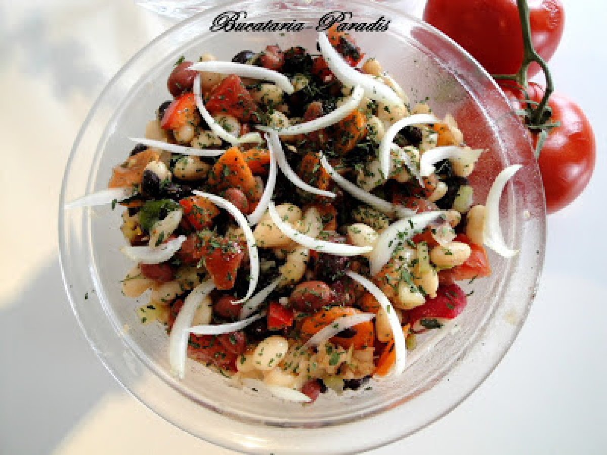 Salata de fasole in culori cu peste afumat PrecedentulUrmătorul Felul principalFoarte ușor1 h 20 m Trimite unui prieten Printează pagina Adresează o întrebare autorului Postează o poză cu rețeta gătită de tine Ingrediente 4 3 cuti mari cu fasole boabe gata fiarta(alba,rosie si neagra) 2 rosii potrivite 2 catei de usturoi razalit 5 linguri ulei de masline 1 ceapa medie dulce 1/2 ardei rosu 1 legatura de ceapa verde 4 ridiche(obtional) 1 morcov(obtional) betze de telina 150 g salmon afumat condimente:sare,piper,boia dulce,oregono.. 2 lingurite suc de lamaie