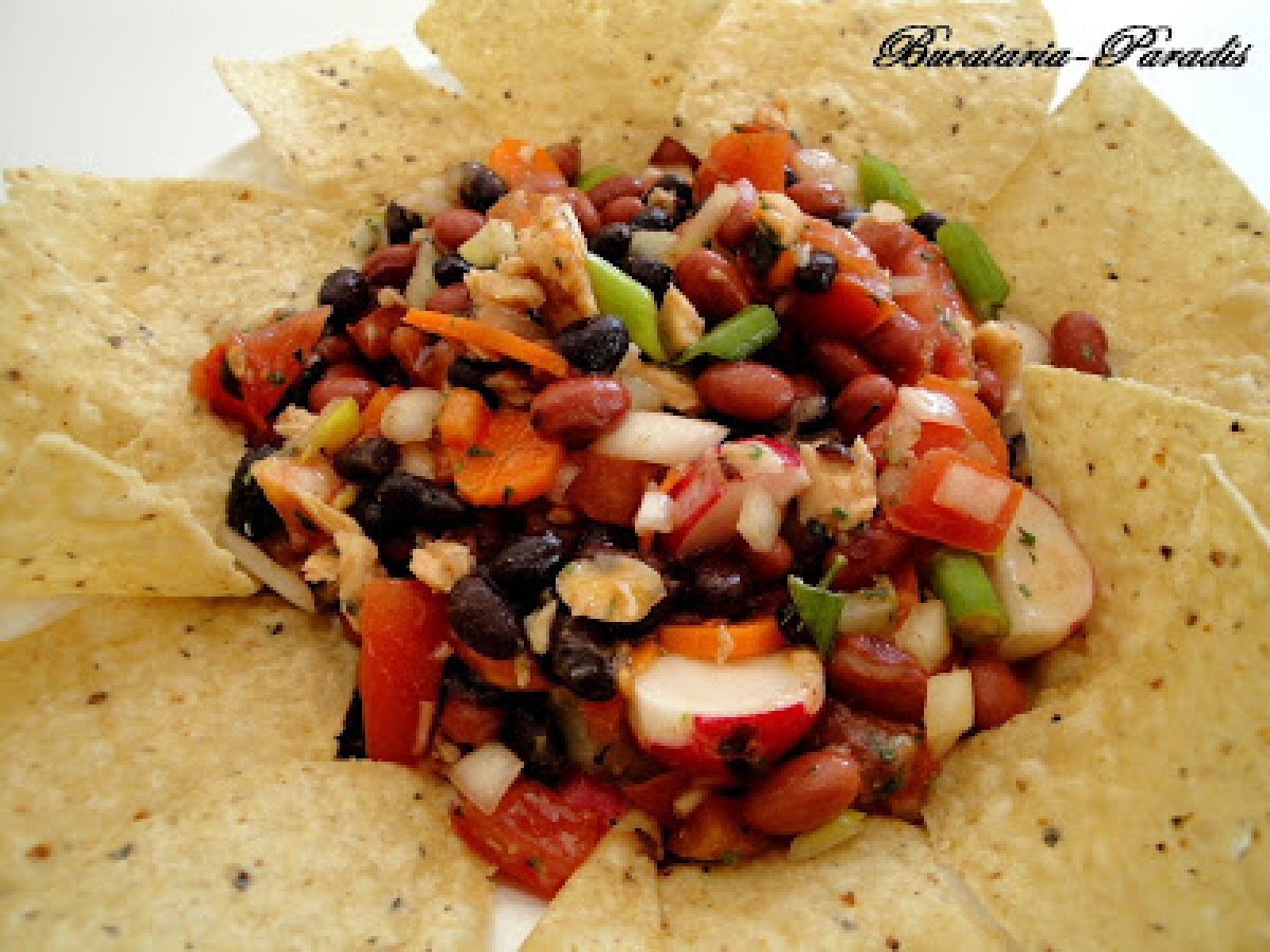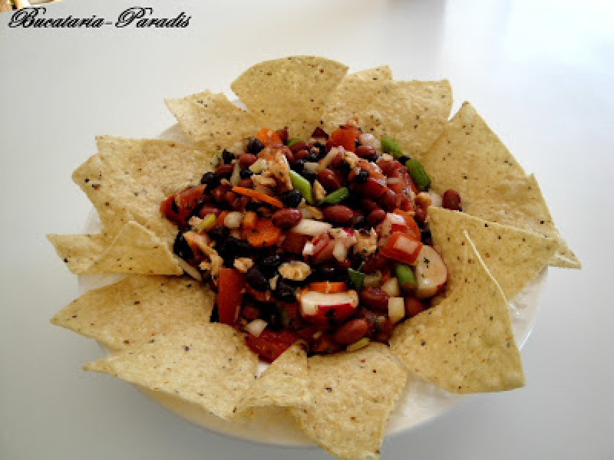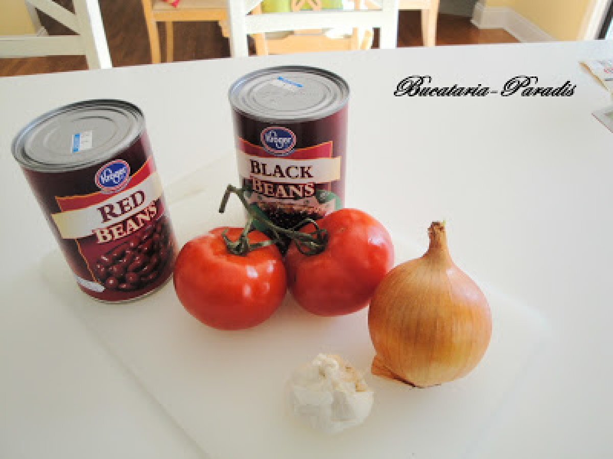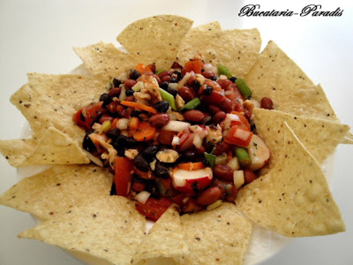 Salata de fasole in culori cu peste afumat PrecedentulUrmătorul Felul principalFoarte ușor1 h 20 m Trimite unui prieten Printează pagina Adresează o întrebare autorului Postează o poză cu rețeta gătită de tine Ingrediente 4 3 cuti mari cu fasole boabe gata fiarta(alba,rosie si neagra) 2 rosii potrivite 2 catei de usturoi razalit 5 linguri ulei de masline 1 ceapa medie dulce 1/2 ardei rosu 1 legatura de ceapa verde 4 ridiche(obtional) 1 morcov(obtional) betze de telina 150 g salmon afumat condimente:sare,piper,boia dulce,oregono.. 2 lingurite suc de lamaie