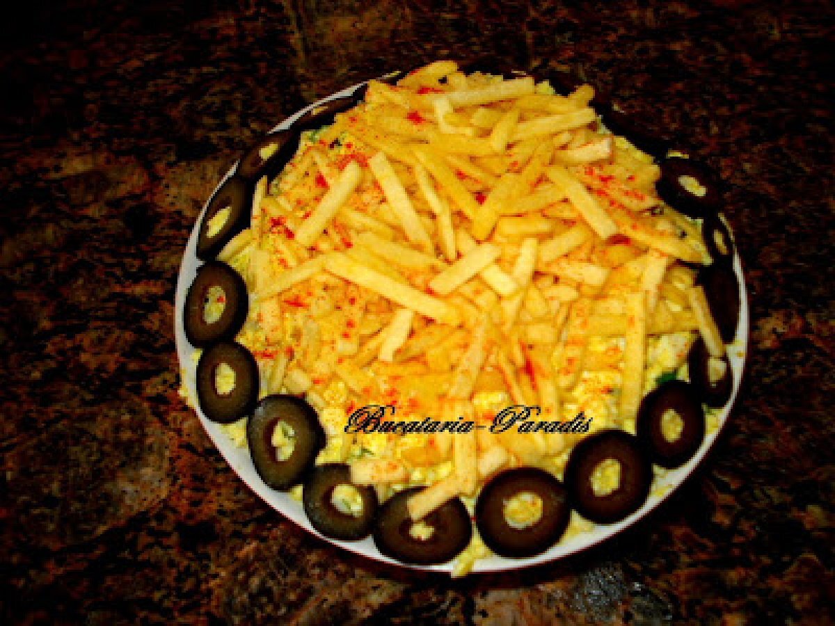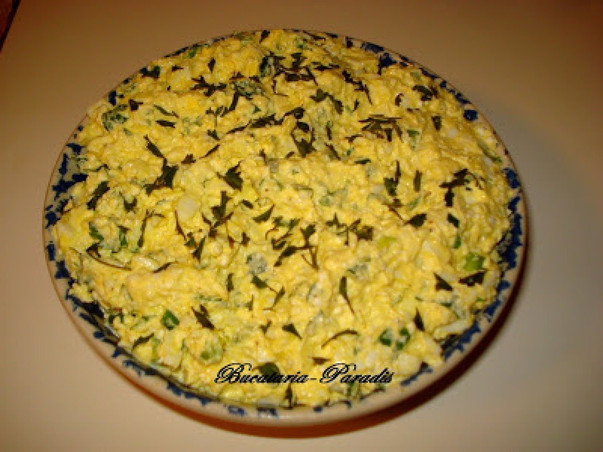 Salata de oua cu brinza si ceapa verde PrecedentulUrmătorul Felul principalFoarte ușor40 min Trimite unui prieten Printează pagina Adresează o întrebare autorului Postează o poză cu rețeta gătită de tine Ingrediente 4 8 (10)oua fierte 100 g brinza de vaca 2 linguri margarina(unt) 1 lingura zeama, de lamaie 1 catel de usturoi 3 linguri maioneza 1 lingura smintina acra piper,sare,patrunjel 5 fire ceapa verde