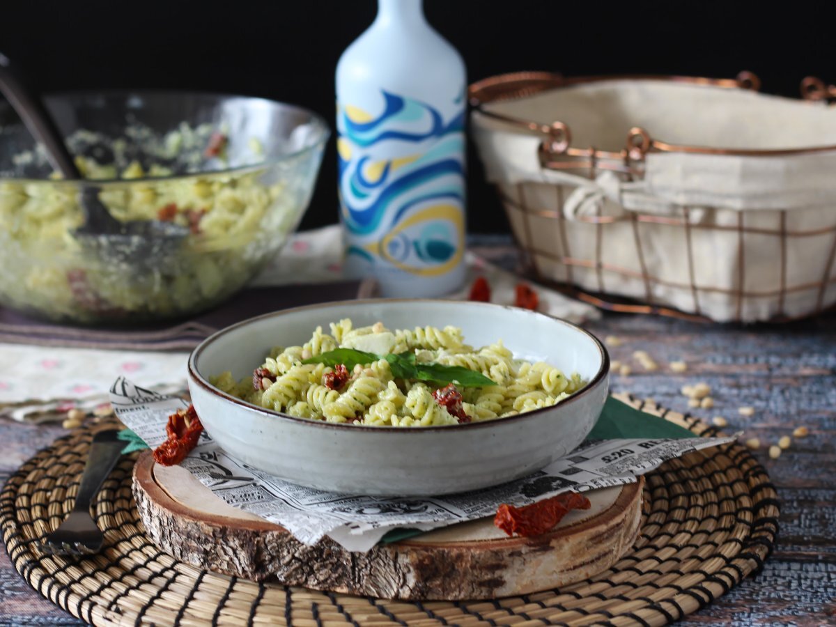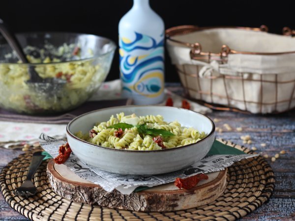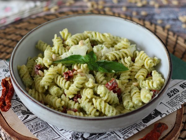 Salata de paste cu pesto de dovlecei, mozzarella și roșii uscate