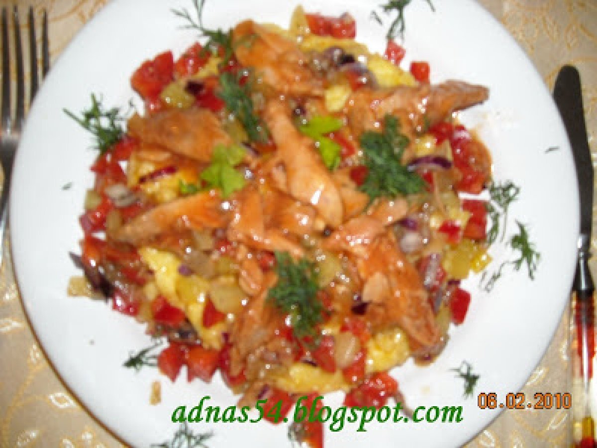 Salata de ton cu mamaliguta Felul principalFoarte ușor1 h 30 m Trimite unui prieten Printează pagina Adresează o întrebare autorului Postează o poză cu rețeta gătită de tine Ingrediente 4 1 conserva de ton bucati in sos tomat 1 ardei rosu 1 ardei verde 1 ceapa rosie coriandru, oregano, busuioc 2 lg. ulei de masline 1 lg. zeama de lamaie sare, piper alb malai (sau paste, orez)